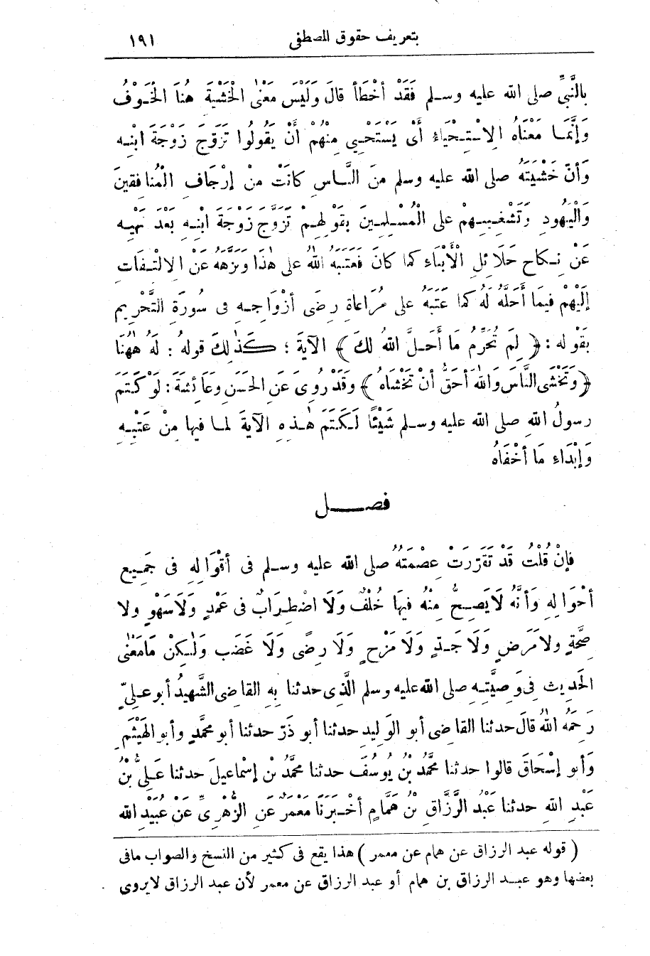 فصل فَإِنّ قُلْت قَد تَقَرّرَت عِصْمَتُه صَلَّى اللَّه عَلَيْه وَسَلَّم فِي أقْوَاله فِي جَمِيع أَحْوَالِه وَأنَّه لَا يَصِحّ مِنْه فِيهَا خُلْف وَلَا اضْطِرَاب فِي عَمْد وَلَا سَهْو وَلَا صِحَّة وَلَا مَرَض وَلَا جَدّ وَلَا مَزْح وَلَا رِضّى وَلَا غَضَب وَلَكِن مَا مَعْنَي الْحَدِيث فِي وَصِيَّتِه صَلَّى اللَّه عَلَيْه وَسَلَّم الَّذِي حَدَّثَنَا بِهِ الْقَاضِي الشَّهِيدُ أَبُو عَلِيٍّ رَحِمَهُ اللَّهُ قَالَ حَدَّثَنَا الْقَاضِي أَبُو الْوَلِيدِ حَدَّثَنَا أَبُو ذَرٍّ حَدَّثَنَا أَبُو مُحَمَّدٍ وَأَبُو الهيثم وَأَبُو إِسْحَاقَ قَالُوا حَدَّثَنَا مُحَمَّدُ بْنُ يُوسُفَ حَدَّثَنَا مُحَمَّدُ بْنُ إِسْمَاعِيلَ حَدَّثَنَا عَلِيُّ بْنُ عَبْدِ اللَّهِ حَدَّثَنَا عَبْدُ الرَّزَّاقِ بْنُ هَمَّامٍ أَخْبَرَنَا مَعْمَرٌ عَنِ الزُّهْرِيِّ عَنِ عُبَيْدِ اللَّهِ