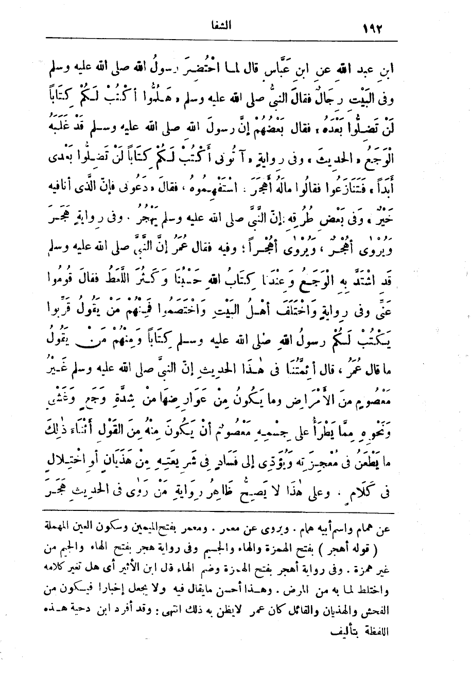 وَفِي رِوَايَة هَجَر ويُرْوى أهُجْر، ويروى أهجرًا، وَفِيه فَقَال عُمَر إنّ النَّبِيّ صَلَّى اللَّه عَلَيْه وَسَلَّم قَد اشتد بِه الوجع وعندنا كِتَاب اللَّه حسبنا وكثر اللعط فمال قُومُوا عَنَّي وَفِي رِوَايَة وَاخْتَلَف أَهْل البَيْت وَاخْتَصَمُوا فَمِنْهُم من يَقُول قَرِّبوا يَكْتُب لَكُم رَسُول اللَّه صَلَّى اللَّه عَلَيْه وَسَلَّم كِتَابًا وَمِنْهُم من يَقُول ما قَال عُمَر، قَال أئِمَّتُنَا فِي هَذَا الْحَدِيث أن النَّبِيّ صَلَّى اللَّه عَلَيْه وَسَلَّم غَيْر معصوم مِن الأمْرَاض وَمَا يَكُون من عَوَارِضِهَا من شِدة وَجَع غشى وَنَحْوَه مِمَّا يَطْرَأ عَلَى جِسْمِه مَعْصُوم أن يَكُون مِنْه مِن القَوْل أثْنَاء ذَلِك مَا يَطْعَن فِي مُعْجِزَتِه وَيُؤَدِي إلى فَسَاد فِي شَرِيعَتِه من هَذَيَان أَو اخْتِلال فِي الكلام.