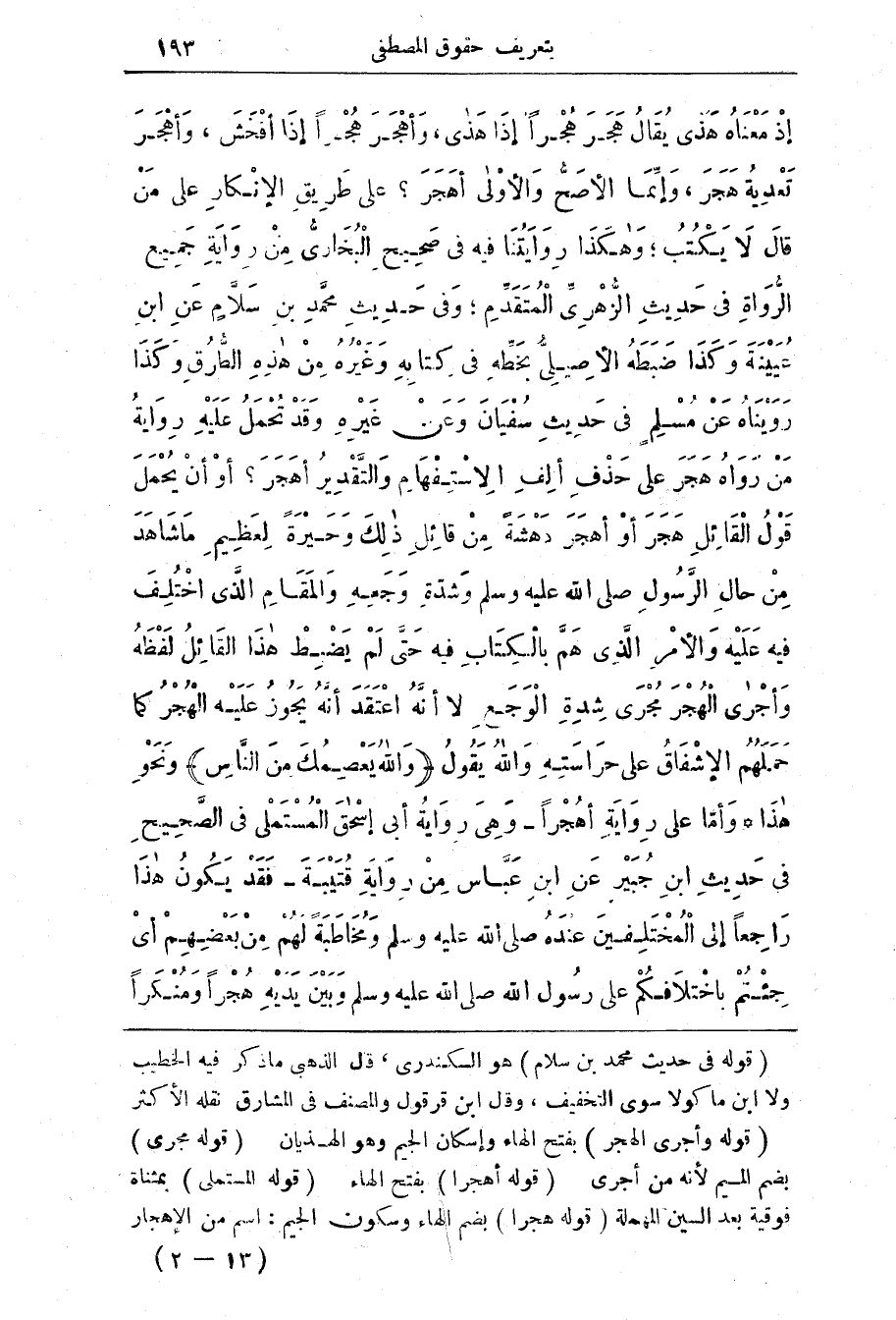 إِذ مَعْنَاه هذى يُقَال هَجر هُجْرًا إذ هذى، وأهجر هجرا إذَا أفْحَش، وَأَهَجَر تَعْدية هَجَر، وَإِنَّمَا الأصَحّ وَالأوْلى أَهَجَر؟ عَلَى طَرِيق الإنْكار عَلَى من قَال لا يكتب، هكذا رِوايَتُنَا فِيه في صحيح الْبُخَارِيّ من رِوَايَة جميع الرُّوَاة فِي حَدِيث الزُّهْرِيّ المُتَقَدّم، وَفِي حَدِيث مُحَمَّد بن سَلَام عَن ابن عُيَيْنَة وَكَذَا ضبَطَه الأصِيلِيّ بِخَطَّه فِي كِتابه وَغَيْرُه من هذه الطُّرُق وكذا رَوَيْنَاه عَن مُسْلِم فِي حَدِيث سُفْيَان وَعَن غَيْرِه وَقَد تحمل عَلَيْه رِوَايَة من رَوَاه هجر عَلَى حذف أَلْف الاستفهام والتقدير أهجر؟ أَو أن يُحْمَل قَوْل القائل هجر أَو أهجر دَهْشَة من قَائل ذَلِك وحيرة لعظيم مَا شاهد من حال الرَّسُول صَلَّى اللَّه عَلَيْه وَسَلَّم وشدة وجعه والمقام الَّذِي اخْتُلِف فِيه عَلَيْه والأمْر الَّذِي هَمّ بالكتاب فِيه حَتَّى لَم يَضبط هَذَا القائل لفظه وأجرى الهجر مجرى شدة الوجع لَا أنَّه اعتقد أنَّه يجوز عَلَيْه الهجر كَمَا حملهم الإشفاق عَلَى حراسته والله يَقُول (وَاللَّهُ يَعْصِمُكَ مِنَ النَّاسِ) ونحو هَذَا * وَأَمَّا عَلَى رِوَايَة أهُجْرا - وَهِي رِوَايَة أَبِي إِسْحَاق المُسْتَمْلِي فِي الصَّحِيح فِي حديث ابن جُبَيْر عَن ابن عَبَّاس من رِوَايَة قُتَيْبَة - فَقَد يَكُون هَذَا رَاجعًا إِلَى المُخْتَلِفِين عِنْدَه صَلَّى اللَّه عَلَيْه وَسَلَّم ومُخَاطَبَة لَهُم من بَعْضُهُم أَي