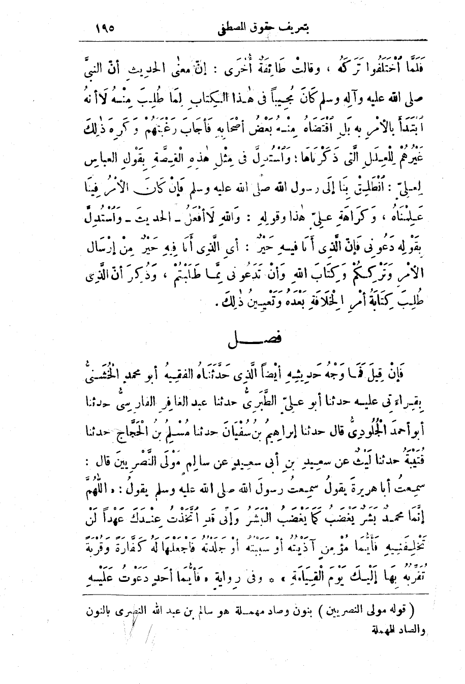 فصل فَإِنّ قِيل فما وجه حَدِيثَه أيْضًا الذى حدثنا الْفَقِيهُ أَبُو مُحَمَّدٍ الْخُشَنِيُّ بِقِرَاءَتِي عَلَيْهِ حَدَّثَنَا أَبُو عَلِيٍّ الطَّبَرِيُّ حَدَّثَنَا عَبْدُ الْغَافِرِ الْفَارِسِيُّ حَدَّثَنَا أَبُو أَحْمَدَ الْجُلُودِيُّ قَالَ حَدَّثَنَا إِبْرَاهِيمُ بْنُ سُفْيَانَ حَدَّثَنَا مُسْلِمُ بْنُ الْحَجَّاجِ حَدَّثَنَا قُتَيْبَةُ حَدَّثَنَا لَيْثٌ عَنْ سَعِيدِ بْنِ أَبِي سَعِيدٍ عَنْ سَالِمٍ مَوْلَى النَّصْرِيِّينَ قَال: سَمِعْتُ أَبَا هُرَيْرَةَ يَقُولُ سَمِعْتُ رَسُولَ اللَّهِ صَلَّى اللَّهُ عَلَيْهِ وَسَلَّمَ يَقُولُ: (اللَّهُمَّ إِنَّمَا مُحَمَّدٌ بَشَرٌ يَغْضَبُ كَمَا يَغْضَبُ الْبَشَرُ وَإِنَّي قَدِ اتَّخَذْتُ عِنْدَكَ عَهْدًا لَنْ تُخْلِفَنِيهِ فَأَيُّمَا مُؤْمِنٍ آذَيْتُهُ أَوْ سَبَبْتُهُ أَوْ جَلَدْتُهُ فَاجْعَلْهَا لَهُ كَفَّارَةً وَقُرْبَةً تُقَرِّبُهُ بِهَا إِلَيْكَ يَوْمَ الْقِيَامَةِ) * وفي رواية (فَأَيُّمَا أَحَدٍ دَعَوْتُ عليه