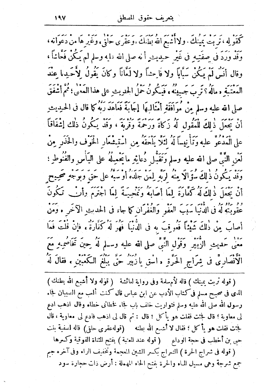 كَقَوْلِه، تَرِبَتْ يَمِينُكَ، ولا أَشْبَعَ اللَّهُ بَطْنَكَ، وعقرى حَلْقَى) وَغَيْرِهَا من دَعَوَاته، وَقَد وَرَد فِي صِفَتِه فِي غَيْر حَدِيث أنَّه صَلَّى اللَّه عَلَيْه وَسَلَّم لَم يَكُن فَحَاشًا، وَقَال أَنَس لَم يَكُن سَبَّابًا وَلَا فَاحِشًا وَلَا لَعَّانًا وَكَان يَقُول لأحَدِنَا عِنْد المَعْتَبَة (مَا لَه؟ تَرب جَبِينُه) فَيَكُون حَمْل الْحَدِيث عَلَى هَذَا الْمَعْنَى، ثُمّ أشفَق صَلَّى اللَّه عَلَيْه وَسَلَّم من مُوَافَقَة أمْثَالهَا إجَابَة فَعَاهَد رَبَّه كَمَا قَال فِي الْحَدِيث أَنّ يَجْعَل ذَلِك لِلْمَقُول لَه زَكاة وَرَحْمَة وَقُرْبَة، وَقَد يَكُون ذلك إشفاقًا عَلَى المدعو عَلَيْه وتأنيسًا لَه لئلًا يَلْحَقَه مِن استِشْعَار الْخَوْف والحَذَر من لَعْن النبي صلى الله عَلَيْه وَسَلَّم وَتَقبُّل دعائه ما يَحْمِلُه عَلَى اليَأْس والقُنُوط، وَقَد يَكُون ذَلِك سُؤَالًا مِنْه لِرَبَّه لمن جَلَدَه أَو سَبَّه عَلَى حَقّ وبوَجْه صحيح أن يَجْعَل ذَلِك لَه كَفَّارَة لَمّا أصَابَه وَتَمْحِيَة لَمّا اجْتَرَم وأن تَكُون عُقُوبَتُه لَه فِي الدُّنْيَا سَبَب العَفْو وَالغُفْرَان كَمَا جاء فِي الْحَدِيث الآخَر (وَمَنْ أَصَابَ مِنْ ذَلِكَ شَيْئًا فَعُوقِبَ بِهِ فِي الدُّنْيَا فَهُوَ لَهُ كَفَّارَةٌ، فَإِنْ قُلْتَ فَمَا مَعْنَي حَدِيثِ الزُّبَيْر وقول النَّبِيّ صَلَّى اللَّه عَلَيْه وَسَلَّم لَه حِينَ تَخَاصُمِهِ مَع الْأَنْصَارِيّ فِي شِرَاج الحَرَّة (اسْقِ يَا زُبَيْرُ حَتَّى يَبْلُغَ الْكَعْبَيْنِ) فَقَالَ له