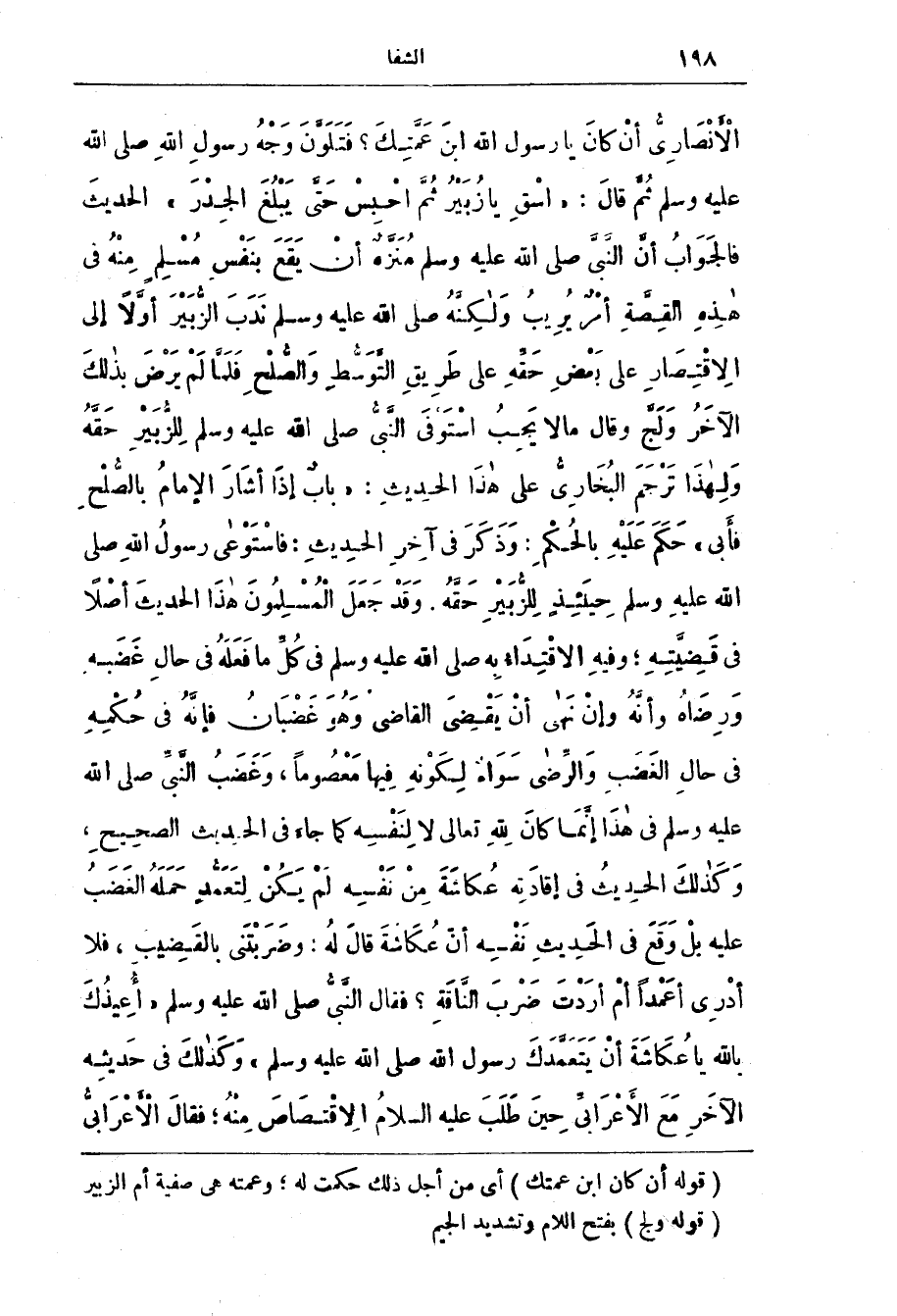 الْأَنْصَارِيُّ أَنْ كَانَ يا رسول الله ابْنَ عَمَّتِكَ؟ فَتَلَوَّنَ وَجْهُ رَسُولِ اللَّهِ صَلَّى اللَّهُ عَلَيْهِ وَسَلَّمَ ثُمّ قَال: (اسْقِ يَا زُبَيْرُ ثُمَّ احْبِسْ حَتَّى يبلغ الجدر) الْحَدِيث فالجواب أَنّ النَّبِيّ صَلَّى اللَّه عَلَيْه وَسَلَّم مُنَزّه أن يَقَع بِنَفْس مُسْلِم مِنْه فِي هَذِه الْقِصَّة أمْر يُريب ولكنه صَلَّى اللَّه عَلَيْه وَسَلَّم نَدَب الزُّبَيْر أوَّلًا إلى الاقْتِصَار عَلَى بَعْض حَقَّه عَلَى طريق التَّوَسُّط وَالصُّلْح فَلَمّا لَم يَرْض بِذَلِك الآخَر وَلَجّ وَقَال مَا لَا يَجِب اسْتَوْفَى النَّبِيّ صَلَّى اللَّه عَلَيْه وَسَلَّم لِلزُّبَيْر حَقَّه ولهذا تَرْجَم الْبُخَارِيّ عَلَى هَذَا الْحَدِيث: (باب إذَا أشَار الْإِمَام بالصُّلْح فأبى) حَكَم عَلَيْه بالحُكْم: وَذَكَر فِي آخِر الْحَدِيث: فاسْتَوْعى رَسُول اللَّه صَلَّى اللَّه عَلَيْه وَسَلَّم حِينَئِذ للزُّبَيْر حَقّه.