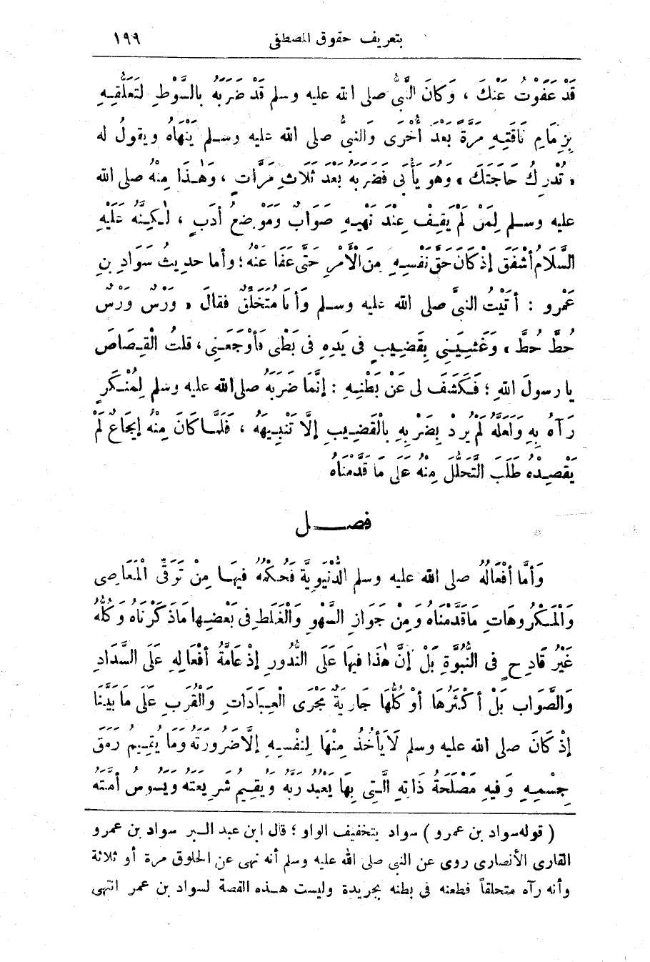 قد عَفَوْت عَنْك، وَكَان النَّبِيّ صَلَّى اللَّه عَلَيْه وَسَلَّم قَد ضَرَبَه بالسَّوْط لتَعلُّقِه بِزِمَام نَاقَته مَرَّة بعد أُخْرَى وَالنَّبِيّ صَلَّى اللَّه عَلَيْه وَسَلَّم يَنْهَاه وَيَقُول لَه (تُدْرَكُ حَاجَتُكَ) وَهُوَ يأتي فَضَرَبَهُ بَعْدُ ثَلَاثَ مَرَّاتٍ، وَهَذَا مِنْهُ صَلَّى الله عليه وَسَلَّمَ لِمَنْ لَمْ يقف منذ نَهْيِهِ صَوَابٌ وَمَوْضعُ أَدَبٍ، لَكِنَّهُ عَلَيْهِ السَّلَامُ أَشْفَق إِذ كَان حَقّ نَفْسِه مِن الأمْر حَتَّى عَفَا عَنْه: وَأَمَّا حَدِيث سَوَاد بن عَمْرو: أتَيْت النَّبِيّ صَلَّى اللَّه عَلَيْه وَسَلَّم وَأَنَا مُتَخَلِّقٌ فَقَالَ (وَرْسَ وَرْسَ حُطَّ حُطَّ) وَغَشِيَنِي بِقَضِيبٍ فِي يَدِهِ فِي بَطْنِي فَأَوْجَعَنِي، قُلْتُ الْقِصَاصُ يَا رَسُولَ اللَّهِ، فَكَشَفَ لِي عَنْ بَطْنِهِ: إِنَّمَا ضَرَبَهُ صَلَّى اللَّهُ عَلَيْه وَسَلَّم لِمُنْكَر رَآه بِه وَلَعَلَّه لَم يُرِد بِضَرْبِه بالْقَضِيب إلَّا تَنْبِيهَه، فَلَمّا كَان مِنْه إيجَاع لَم يَقْصِدْه طلب التَّحَلُّل منه عن مَا قَدَّمْنَاه