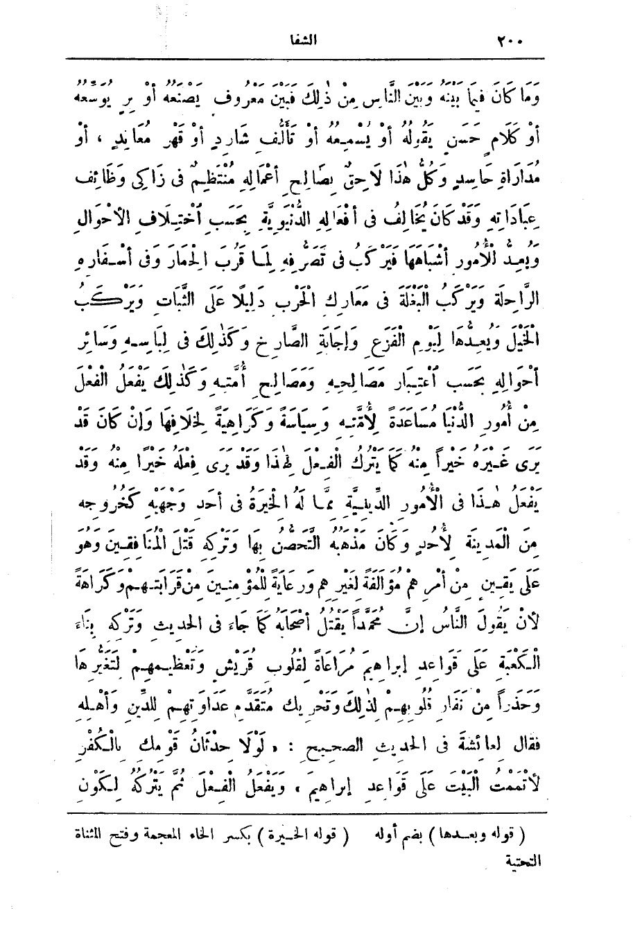 وَمَا كَان فِيمَا بَيْنَه وَبَيْن النَّاس من ذَلِك فَبَيْن مَعْرُوف يَصْنَعُه أَو بِرّ يُوَسعُه أَو كلام حسن يقوله أَو يسمعه أَو تألف شارد أَو قَهْر معاند، أَو مداراة حَاسِد وَكُلّ هَذَا لاحِق بصَالِح أعْمَالِه مُنْتَظِم فِي زَاكِي وَظَائف عِبَادَاته وَقَد كَان يُخَالف فِي أفْعَاله الدُّنْيَويَّة بِحسَب اخْتِلَاف الأحْوَال ويُعِدّ للأمُور أشْبَاهَهَا فَيَرْكَب فِي تَصَرُّفِه لَمّا قَرُب الْحِمَار وَفِي أسْفَارِه الرّاحلَة وَيَرْكَب الْبَغْلَة فِي مَعَارِك الْحَرْب دَلِيلًا عَلَى الثّبَات وَيَرْكَب الْخَيْل وَيُعِدّها لِيَوْم الْفَزَع وَإجَابَة الصّارخ وَكَذَلِك فِي لِبَاسِه وَسَائِر أحْوَاله بِحَسَب اعْتِبَار مَصَالحِه وَمَصَالح أمَّتَه وكذلك يَفْعَل الْفعْل من أُمُور الدُّنْيَا مُسَاعَدَة لأمَّتَه وَسِيَاسَة وَكَرَاهِيَة لِخَلافِهَا وإن كان قد يرى غَيْرِه خيرًا مِنْه كَمَا يَتْرُك الْفَعْل لهذا وَقَد يَرَى فَعْلَه خَيْرًا مِنْه وَقَد يَفْعَل هَذَا فِي الأمور الدّينيّة مِمَّا لَه الْخِيرَة فِي أَحَد وَجْهَيْه كَخُروجِه مِن الْمَدِينَة لأُحُد وَكَان مَذْهَبُه التَّحَصُن بِهَا وَتَرْكِه قَتْل المُنَافِقِين وَهُو عَلَى يَقِين من أمْرِهِم مُؤَالَفَة لِغَيْرِهِم ورِعَايَة للْمُؤْمِنين من قَرَابَتِهِم وَكَرَاهَة لِأَنّ يَقُول النَّاس إنّ مُحَمَّدًا يَقْتُل أصْحَابَه كَمَا جاء فِي الْحَدِيث وتَرْكِه بِنَاء الكَعْبَة عَلَى قَوَاعِد إبْرَاهِيم مُراعَاة لِقُلُوب قُرَيْش وَتَعْظِيمهم لتَغَيُّرِهَا وَحَذَرًا من نَفَار قُلُوبهم لذلك وَتَحْرِيك متقدم عداوتهم للدِين وأهله فَقَال لعائشة فِي الْحَدِيث الصَّحِيح: (لَوْلَا حِدْثَانٌ قَوْمِكِ بِالْكُفْرِ لأَتْمَمْتُ الْبَيْتَ عَلَى قَوَاعِدَ إِبْرَاهِيمَ) ويفعل الفعل ثم يتركه لكون