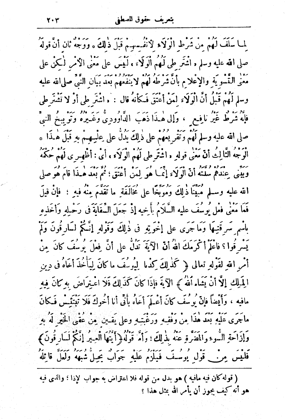 لَمّا سلف لَهُم من شرط الولاء لأنفسهم قَبْل ذَلِك * وَوَجْه ثان أَنّ قَوْله صَلَّى الله عليه وسلم (اشترط لَهُمُ الْوَلَاءَ) لَيْس عَلَى مَعْنَي الأمْر لَكِن عَلَى مَعْنَي التَّسْوِيَة والإعْلام بأنّ شَرْطَه لَهُم لَا يَنْفَعُهُم بَعْد بَيَان النَّبِيّ صَلَّى اللَّه عَلَيْه وَسَلَّم لَهُم قَبْل أَنّ الْوَلَاء لمن أعْتَق فَكَأنه قال: (اشترطي أولا تَشْتِرِطِي فَإِنَّهُ شَرْطٌ غَيْرُ نَافِعٍ، وَإِلَى هَذَا ذهب الداوودى وَغَيْرُهُ وَتَوْبِيخُ النَّبِيِّ صَلَّى اللَّهُ عَلَيْهِ وَسَلَّمَ لَهُمْ وَتَقْرِيعُهُمْ عَلَى ذَلِكَ يَدُلُّ عَلَى عِلْمِهِمْ بِهِ قَبْلَ هَذَا * الْوَجْه الثّالِث أَنّ مَعْنَي قَوْلِه (اشْتَرِطِي لَهُمُ الْوَلَاءَ) أي: أظْهِرِي لَهُم حُكْمَه وَبَيّنِي عِنْدَهُم سَنّتَه أَنّ الْوَلَاء إنَّمَا هُو لِمَن أعْتَق، ثُمّ بَعْد هَذَا قَام هُو صَلَّى اللَّه عَلَيْه وَسَلَّم مُبَيّنًا ذَلِك وَمُوَبّخًا عَلَى مُخَالَفَة مَا تَقَدّم مِنْه فِيه، فَإِنّ قِيل فَمَا مَعْنَي فعل يُوسُف عَلَيْه السَّلَام بأخِيه إِذ جَعَل السّقَايَة فِي رَحْلِه وَأخَذِه باسْم سَرِقَتِهَا وَمَا جَرَى عَلَى إخْوتِه فِي ذلك وقوله إنكم لسارقون وَلَم يَسْرِقُوا؟ فاعْلَم أكْرَمَك اللَّه أَنّ الآيَة تَدُلّ عَلَى أَنّ فِعْل يُوسُف كَان من أمْر الله لقومه تعالى (كذلك؟ ؟ ؟ ؟ لِيُوسُفَ مَا كَانَ لِيَأْخُذَ أَخَاهُ فِي دِينِ الْمَلِكِ إِلا أَنْ يَشَاءَ اللَّهُ) الآيَة فَإِذَا كَان كَذَلِك فَلَا اعْتِرَاض بِه كَان فِيه مَا فِيه، وأَيْضًا فَإِنّ يُوسُف كَان أعْلَم أخاه بأنّي أَنَا أخُوك فَلَا تَبْتَئِس فكان مَا جرى عَلَيْه بَعْد هَذَا من وَفَّقَه ورغبته وَعَلَى يقين من عقى الخَيْر لَه بِه وَإزَاحَة السُّوء وَالمَضَرَة عَنْه بِذَلِك، وَأَمَّا قَوْله (أَيَّتُهَا الْعِيرُ إِنَّكُمْ لَسَارِقُونَ) فَلَيْس من قَوْل يُوسُف فَيَلْزَم عَلَيْه جَوَاب يَحِلّ شُبَهَه ولعل قائله