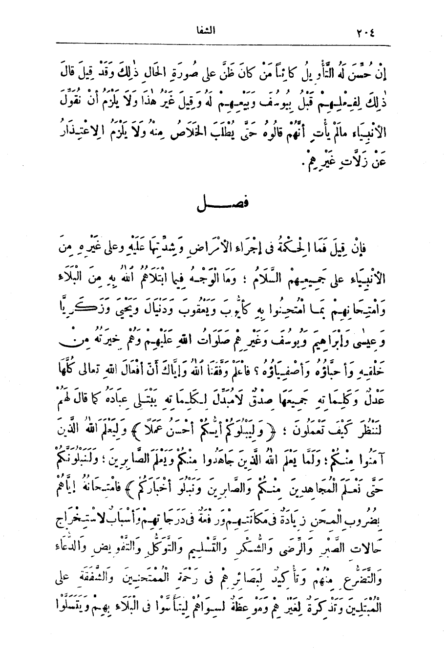 فصل فَإِنّ قِيل فَمَا الحِكْمَة فِي إجْرَاء الأمْرَاض وَشِدّتِهَا عَلَيْه وَعَلَى غَيْرِه مِن الْأَنْبِيَاء عَلَى جميعهم السَّلَام، وَمَا الْوَجْه فِيمَا ابْتَلاهُم اللَّه بِه مِن الْبَلَاء وَامْتِحَانِهِم بِمَا امتحنوا بِه كَأَيُّوب وَيَعْقُوب وَدَنْيَال وَيَحْيَى وزَكَرِيَّا وَعِيسَى وإِبْرَاهِيم وَيُوسُف وَغَيْرِهِم صلوات اللَّه عَلَيْهِم وهم خِيَرتُه من خَلْقِه وَأحبّاؤُه وَأصْفِيَاؤُه؟ فاعْلَم وفَّقَنَا اللَّه وإياك أَنّ أفْعَال اللَّه تَعَالَى كلها عَدْل وَكَلِمَاتِه جميعا صِدْق لَا مُبَدّل لِكَلِمَاتِه يَبْتَلي عِبَادَه كَمَا قَال لَهُم لننظر كيف تعلمون، (وليبلوكم أَيُّكُمْ أَحْسَنُ عَمَلا) وَلِيَعْلَمَ اللَّهُ الَّذِينَ آمنوا مِنْكُم، وَلَمَّا يَعْلَمِ الله الذين جاهوا مِنْكُمْ وَيَعْلَمَ الصَّابِرِينَ، وَلَنَبْلُوَنَّكُمْ حَتَّى نَعْلَمَ الْمُجَاهِدِينَ مِنْكُمْ وَالصَّابِرِينَ وَنَبْلُوَ أخباركم) فامْتحَانُه إيّاهُم بِضُرُوب الْمِحَن زيَادَة فِي مَكانِتِهِم وَرفْعَة فِي دَرَجَاتِهِم وَأسْبَاب لاسْتِخْرَاج حَالات الصَّبْر وَالرّضَى وَالشُّكر وَالتّسْلِيم وَالتّوكُّل والتّفْويض وَالدُّعَاء وَالتّضَرُّع مِنْهُم وتأْكِيد لِبَصَائِرِهِم فِي رَحْمَة الْمُمْتحِنين وَالشّفَقَة عَلَى الْمُسْلِمِين وَتَذْكِرَة لِغَيْرِهِم وَمَوْعِظَة لسَوَاهُم لِيَتأسّوْا فِي الْبَلَاء بهم وَيَتَسَلّوْا