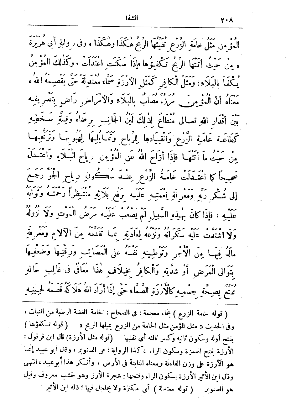 الْمُؤْمِنِ مِثْلُ خَامَةِ الزَّرْعِ تُفَيِّئُهَا الرَّيحُ هَكَذَا وَهَكَذَا) وَفِي رِوَايَةِ أَبِي هُرَيْرَةَ (مِنْ حَيْثُ أَتَتْهَا الرِّيحُ تَكْفِؤُهَا فَإِذَا سَكَنَتِ اعْتَدَلَتْ، وَكَذَلِكَ الْمُؤْمِنُ يُكْفَأُ بِالْبَلَاءِ، وَمَثَلُ الْكَافِرِ كَمَثَلِ الأَرْزَةِ صَمَّاءَ مُعْتَدِلَةٍ حَتَّى يَقْصِمَهُ اللَّهُ) مَعْنَاه أَنّ الْمُؤْمِن مُرَزَّء مُصَاب بِالْبَلَاء وَالأمراض رَاض بِتَصْرِيفِه بَيْن أقْدَار اللَّه تَعَالَى مُنْطَاع لِذَلِك لَيَّن الجَانِب بِرِضَاه وَقِلَّة سَخَطِه