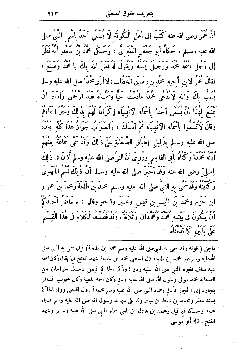 أَنّ عُمَر رَضِي اللَّه عَنْه كَتَب إِلَى أَهْل الكُوفَة لَا يُسَمّى أَحَد باسْم النَّبِيّ صَلَّى اللَّه عَلَيْه وَسَلَّم) حَكَاه أَبُو جَعْفَر الطَّبَرِيّ، وَحَكَى مُحَمَّد بن سَعْد أنَّه نَظَر إِلَى رَجُل اسْمُه مُحَمَّد وَرَجُل يُسَبُّه وَيَقُول لَه فعل اللَّه بك يَا مُحَمَّد وَصَنَع، فَقَال عُمَر لابن أخيه مُحَمَّد بن زيد بن الْخَطَّاب: لَا أرَى مُحَمَّدًا صَلَّى اللَّه عَلَيْه وَسَلَّم يُسَبّ بِك والله لَا تُدْعى مُحَمَّدًا مَا دُمْت حَيًّا وَسَمَّاه عَبْد الرَّحْمن وَأرَاد أن يَمْنَع لهذا أن يُسَمَّى أحَد بِأسْمَاء لأنبياء إكْرَامًا لَهُم بِذَلِك وَغَيْر أسْمَاءَهُم وَقَال لَا تُسَمُّوا بأسْمَاء الْأَنْبِيَاء ثُمّ أمْسَك، وَالصُّوَاب جَوَاز هَذَا كُلُّه بَعْدَه