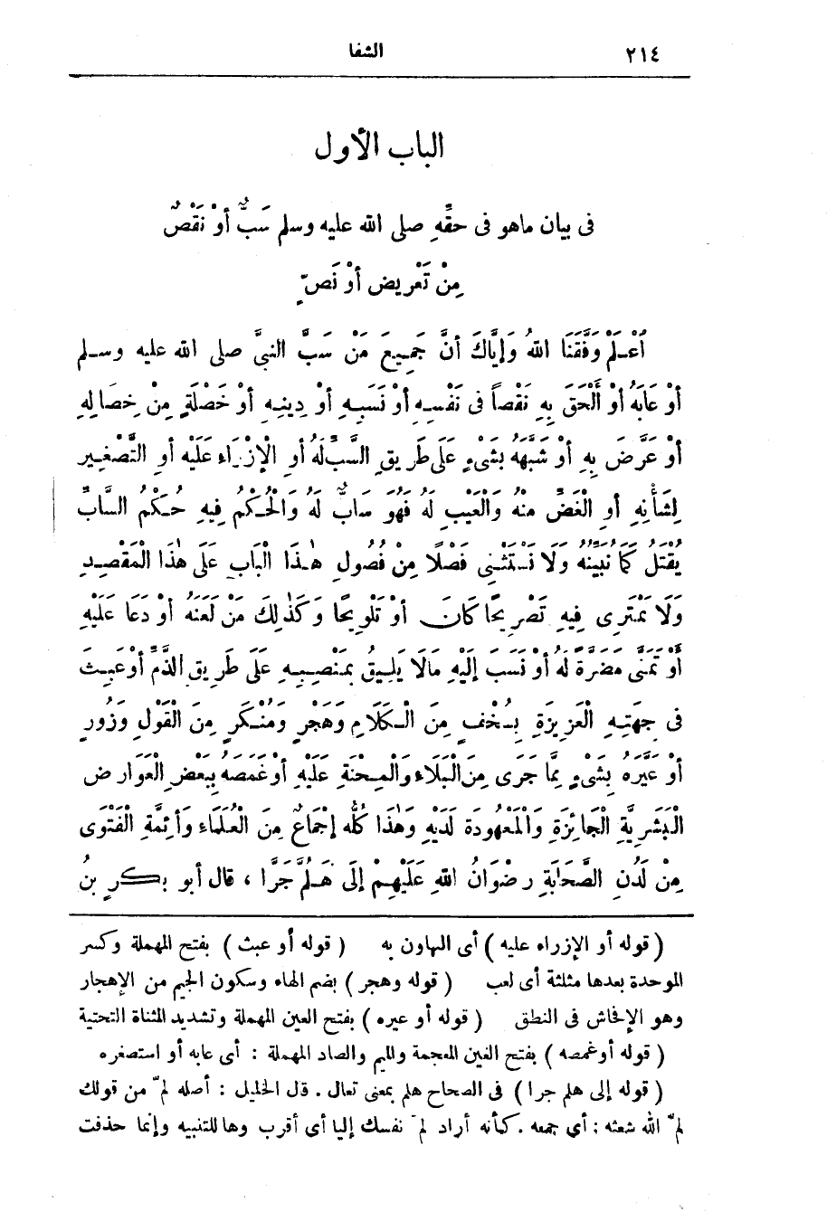 اعْلَم وفقنا اللَّه وإياك أَنّ جَمِيع من سَبّ النَّبِيّ صَلَّى اللَّه عَلَيْه وَسَلَّم أَو عَابَه أَو ألْحَق بِه نَقْصًا فِي نَفْسِه أَو نَسَبِه أَو دِينه أَو خَصْلَة من خِصَالِه أَو عَرّض بِه أو شبهة بشئ عَلَى طريق السَّبّ لَه أَو الأِزْرَاء عَلَيْه أو التَّصْغِير لِشَأْنِه أَو الْغَضّ مِنْه وَالْعَيْب لَه فَهُو سَاب لَه وَالْحُكْم فِيه حُكْم السَّابّ يقْتَل كَمَا نُبَيّنُه وَلَا نَسْتَثْنِي فَصْلًا من فُصُول هَذَا الْبَاب عَلَى هَذَا المقصد وَلَا يمترى فِيه تصريحا كَان أَو تلويحا وَكَذَلِك من لعنه أَو دعا عَلَيْه أَو تمنى مضرة لَه أو نسب إليه مَا لَا يليق بمنصبه عَلَى طريق الذم أَو عبث فِي جهَتِه العَزِيزَة بسُخْف مِن الْكَلَام وَهُجْر وَمُنْكَر مِن الْقَوْل وَزُور أَو عيره بشئ مِمَّا جَرَى مِن الْبَلَاء والْمِحْنَة عَلَيْه أَو غَمَصَه بِبَعْض الْعَوَارض الْبَشَرِيّة الْجَائِزَة وَالْمَعْهُودَة لَدَيْه وَهَذَا كُلُّه إجْماع مِن الْعُلمَاء وَأئِمَّة الْفَتْوَى من لَدُن الصَّحَابَة رِضْوَان اللَّه عَلَيْهِم إِلَى هَلُمّ جَرّا، قال أبو بكر بن