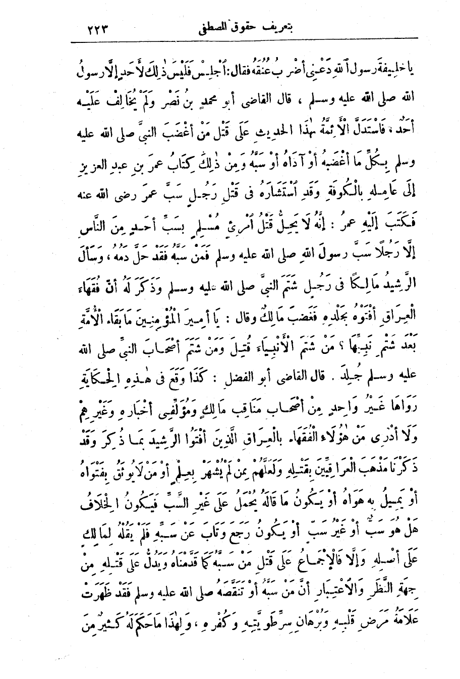 يَا خليفة رَسُول اللَّه دعني أضرب عنقه فَقَال: اجلس فليس ذَلِك لأحد إلَّا رَسُول اللَّه صَلَّى اللَّه عَلَيْه وَسَلَّم، قَال الْقَاضِي أَبُو مُحَمَّد بن نصر وَلَم يُخَالِف عَلَيْه أَحَد، فَاسْتَدَلّ الْأَئِمَّة بَهَذَا الْحَدِيث عَلَى قَتْل من أغْضَب النَّبِيّ صَلَّى اللَّه عَلَيْه وَسَلَّم بِكُلّ مَا أغْضَبه أو آداه أَو سَبّه وَمِن ذَلِك كِتَاب عُمَر بن عَبْد الْعَزِيز إِلَى عَامِله بِالكُوفَة وَقَد استشَارَه فِي قَتْل رَجُل سَبّ عُمَر رَضِي اللَّه عَنْه فَكَتَب إليْه عُمَر: أنَّه لَا يَحِلّ قَتْل امْرِئ مُسْلِم بسَبّ أحد مِن النَّاس إلَّا رَجُلًا سَبّ رَسُول اللَّه صَلَّى اللَّه عَلَيْه وَسَلَّم فَمَن سَبَّه فَقَد حَلّ دَمُه، وَسَأل الرَّشيد مالِكًا فِي رَجُل شَتَم النَّبِيّ صَلَّى اللَّه عَلَيْه وَسَلَّم وَذَكَر لَه أَنّ فُقَهَاء الْعِرَاق افْتَوْه بِجَلْدِه فَغَضب مَالِك وَقَال: يَا أَمِير الْمُؤْمِنين مَا بَقَاء الْأُمَّة بَعْد شَتْم نَبِيّهَا؟ من شَتَم الْأَنْبِيَاء قُتِل وَمِن شَتَم أَصْحَاب النَّبِيّ صَلَّى اللَّه عَلَيْه وَسَلَّم جُلِد.