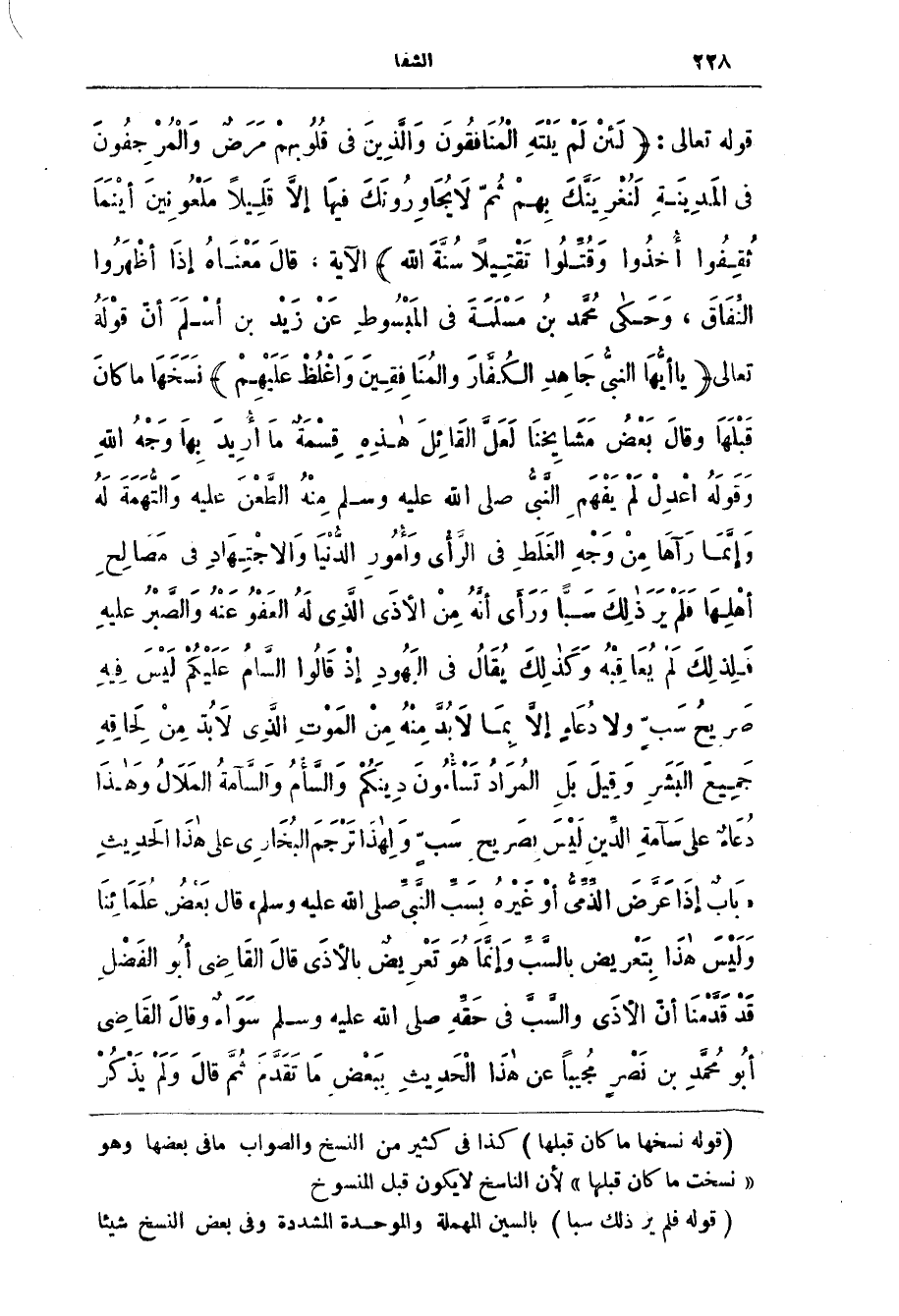 تعالى (يا أيها النَّبِيُّ جَاهِدِ الْكُفَّارَ وَالْمُنَافِقِينَ وَاغْلُظْ عَلَيْهِمْ) نَسَخَها مَا كَان قبلها وَقَال بَعْض مَشَايِخَنَا لَعَلّ القَائِل هَذِه قِسْمَة مَا أُرِيد بِهَا وَجْه اللَّه وَقَوْلُه أعْدِل لَم يَفْهَم النَّبِيّ صلى الله عليه وسلم منه اطعن عَلَيْه وَالتَّهَمَة لَه وَإِنَّمَا رَآهَا من وَجْه الغَلَط فِي الرَّأْي وَأُمُور الدُّنْيَا وَالاجْتِهَاد فِي مَصَالِح أهْلِهَا فَلَم يَر ذَلِك سَبًّا وَرَأى أنَّه مِن الأذَى الَّذِي لَه العَفْو عَنْه والصّبْر عَلَيْه فلذلك لَم يُعَاقِبْه وكَذَلِك يُقَال فِي اليَهُود إِذ قَالُوا السَّام عَلَيْكُم لَيْس فِيه صَرِيح سَبّ وَلَا دُعَاء إلَّا بِمَا لَا بُد مِنْه مِن الموت الَّذِي لَا بُد من لِحَاقِه جميع البَشَر وَقِيل بَل المراد؟ ؟ ؟ لون دِينَكُم وَالسّأْم وَالسّآمة المَلَال وَهَذَا دُعَاء عَلَى سَآمة الدين لَيْس بِصَريح سَبّ ولهذا تَرْجَم الْبُخَارِيّ عَلَى هَذَا الْحَدِيث (باب إذَا عَرَّض الذّمّيّ أَو غَيْرِه بِسَبّ النَّبِيّ صَلَّى اللَّه عَلَيْه وَسَلَّم) قَال بَعْض عُلَمَائِنَا وَلَيْس هَذَا بِتَعْرِيض بالسّبّ وَإِنَّمَا هُو تَعْرِيض بالأذَى قَال الْقَاضِي أَبُو الْفَضْل قَد قَدَّمْنَا أَنّ الأذَى والسّبّ فِي حَقّه صَلَّى اللَّه عَلَيْه وَسَلَّم سَوَاء وَقَال الْقَاضِي أَبُو مُحَمَّد بن نَصْر مُجيبًا عَن هَذَا الْحَدِيث ببعض مَا تقدم ثُمّ قَال ولم يذكر