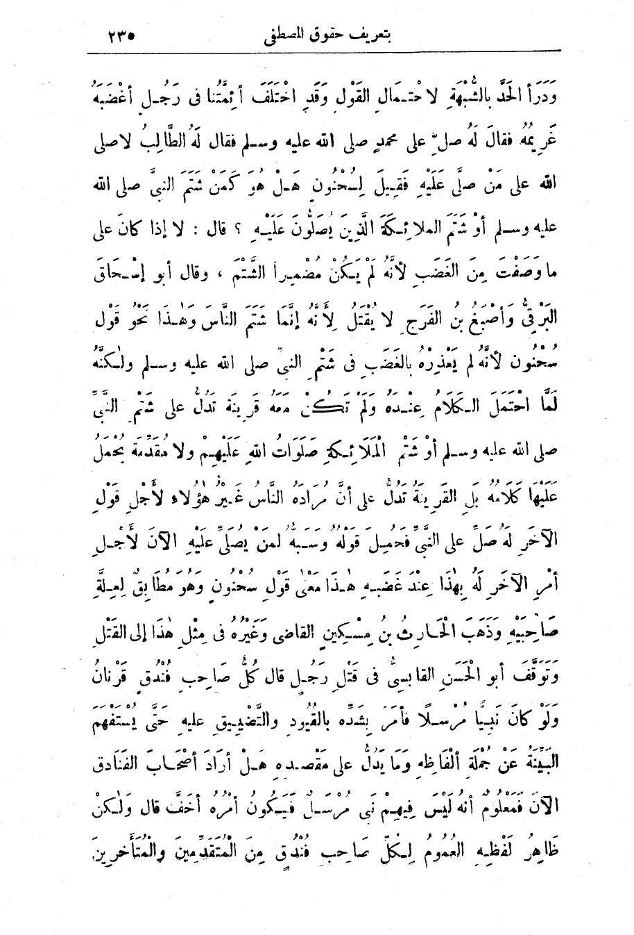 وَدَرَأ الحَد بالشّبْهَة لاحْتِمَال القَوْل وَقَد اخْتُلِف أئِمّتُنا فِي رَجُل أغْضَبَه غَريمُه فَقَال لَه صلّ عَلَى مُحَمَّد صَلَّى اللَّه عَلَيْه وَسَلَّم فَقَال لَه الطَّالِب لَا صَلَّى اللَّه عَلَى من صَلَّى عَلَيْه فَقِيل لِسُحْنُون هَل هُو كَمَن شَتَم النَّبِيّ صَلَّى اللَّه عَلَيْه وَسَلَّم أَو شَتم الْمَلَائِكَة الَّذِين يُصَلُّون عَلَيْه؟ قَال: لَا إذَا كَان عَلَى مَا وَصَفْت من الغَضَب لأنه لم يَكُن مُضْمِرًا الشّتْم، وَقَال أَبُو إِسْحَاق البَرْقِيّ وأصْبَغ بن الفَرَج لَا يُقْتَل لِأَنَّه إنَّمَا شَتَم النَّاس وَهَذَا نَحْو قَوْل سُحْنُون لِأَنَّه لَم يَعْذِرْه بالغضَب فِي شَتَم النَّبِيّ صَلَّى اللَّه عَلَيْه وَسَلَّم ولكنه لَمّا احْتَمَل الْكَلَام عِنْدَه وَلَم تكن مَعَه قَرِينَة تَدُلّ عَلَى شتم النبي صلى الله عليه وسلم أو شَتْم الْمَلَائِكَة صَلَوات اللَّه عَلَيْهِم وَلَا مُقَدّمَة يُحْمِل عَلَيْهَا كلامه بَل القرينة تدل عَلَى أَنّ مراده النَّاس غَيْر هَؤْلَاء لِأَجْل قَوْل الآخر لَه صَلَّى عَلَى النَّبِيِّ فحمل قَوْله وسبه لِمَن يُصَلّي عَلَيْه الآن لأجْل أمْر الآخَر لَه بَهَذَا عِنْد غضبه هَذَا معنى قوله سُحْنُون وهو مطابق لعلة صاحبيه وذهب الحَارِث بن مسكين الْقَاضِي وَغَيْرُه فِي مِثْل هَذَا لإلى القتل وتوقف أَبُو الْحَسَن القابسي فِي قَتْل رَجُل قَال كُلّ صَاحِب فُنْدُق قَرْنان وَلَو كَان نَبِيًّا مُرْسلًا فأمَر بِشَدّه بالقُيُود وَالتّضْيِيق عَلَيْه حَتَّى يُسْتَفْهَم البَيّنَة عَن جُمْلَة ألفَاظِه وَمَا يَدُلّ عَلَى مَقْصدِه هَل أرَاد أصْحَاب الفَنَادق الآن فَمَعْلُوم أنَّه لَيْس فِيهِم نَبِيّ مُرْسل فيكون أمْرُه أخفّ قَال وَلَكِن
