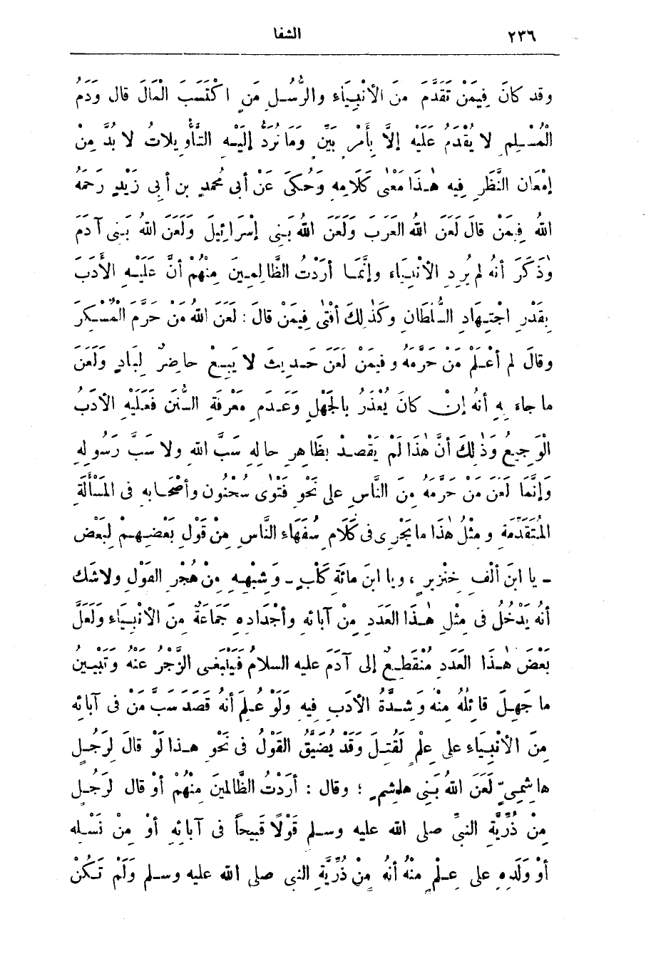 وَقَد كَان فِيمَن تَقدّم مِن الْأَنْبِيَاء والرُّسُل مِن اكْتَسَب الْمَال قَال وَدَم المسلم لَا يُقْدَم عَلَيْه إلَّا بِأَمْر بَيْن وَمَا تُرَدّ إليه التأويلات لَا بُد من إمْعان النَّظَر فِيه هَذَا مَعْنَي كلامه وحُكي عَن أَبِي مُحَمَّد بن أَبِي زَيْد رَحِمَه اللَّه فِيمَن قَال لَعَن اللَّه العَرَب وَلَعَن اللَّه بَنِي إِسْرَائِيل ولعن اللَّه بَنِي آدَم وَذَكَر أنَّه لَم يُرد الْأَنْبِيَاء وَإِنَّمَا أرَدْت الظّالمِين مِنْهُم أَنّ عَلَيْه الأدَب بِقَدْر اجْتِهَاد السُّلْطَان وَكَذَلِك أفْتى فِيمَن قَال: لعن اللَّه من حرم المسكر وَقَال لَم أَعْلَم من حَرّمَة وفيمن لَعَن حَدِيث لَا يَبَع حاضَر لِبَاد ولعن مَا جاء بِه أنَّه إنّ كَان يُعْذَر بالجَهل وعدم معرفة السُّنَن فَعَلَيْه الأدب الْوَجِيع وَذَلِك أَنّ هَذَا لَم يَقْصد بِظَاهِر حاله سَبّ اللَّه وَلَا سَبّ رَسُولِه وَإِنَّمَا لعن من حَرّمَه مِن النَّاس عَلَى نَحْو فَتْوى سُحْنُون وأصحابه فِي المَسْأَلَة المُتَقَدّمَة ومثل هَذَا مَا يَجْرِي فِي كَلَام سُفَهَاء النَّاس من قوله بَعْضُهُم لِبَعْض - يَا ابْن أَلْف خِنْزِير، ويا ابن مِائَة كَلْب - وَشِبْهِه من هُجْر القَوْل وَلَا شك أنَّه يَدْخل فِي مِثْل هَذَا العدد من آبائه وأجْدَادِه جَمَاعَة مِن الْأَنْبِيَاء وَلَعَلّ بَعْض هَذَا العَدَد مُنْقَطِع إِلَى آدَم عَلَيْه السلام فيبلغني الزّجْر عَنْه وتبيين مَا جهل قائله مِنْه وشدة الأدَب فِيه وَلَو علم أنَّه قَصَد سَبّ من فِي آبائِه مِن الْأَنْبِيَاء عَلَى علم لَقُتِل وَقَد يُضَيَّق القَوْل فِي نَحْو هَذَا لَو قال لرجل هاشمى لعن الله بنى هاشم، وقال: أرَدْت الظّالمِين مِنْهُم أو قَال لِرَجُل من ذُرّيّة النَّبِيّ صَلَّى اللَّه عَلَيْه وَسَلَّم قَوْلًا قَبيحًا فِي آبائِه أَو من نَسْلِه أَو وَلَدِه عَلَى علم مِنْه أنَّه من ذُرّيَّة النَّبِيّ صَلَّى اللَّه عَلَيْه وَسَلَّم وَلَم تكن