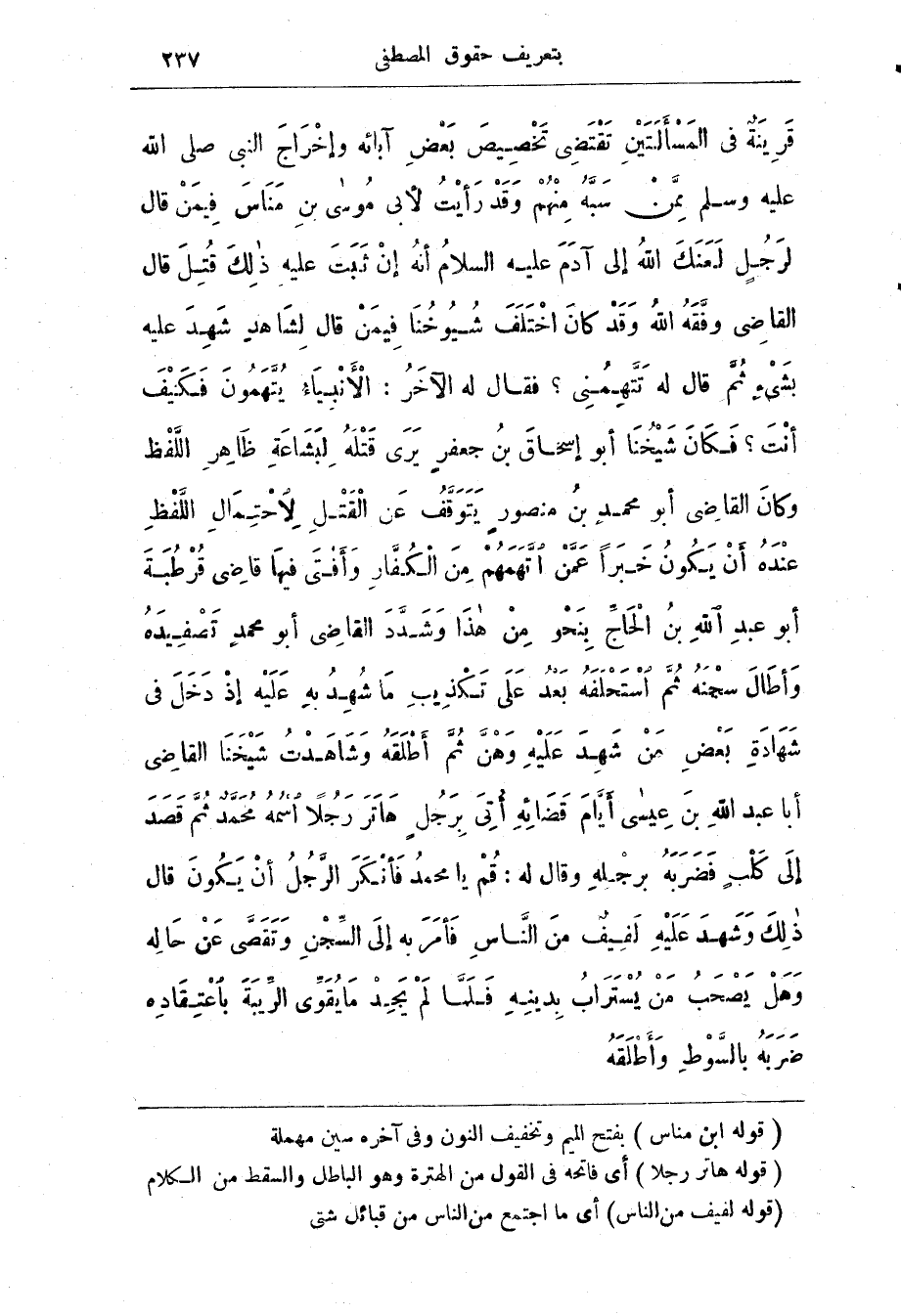 قَرِينَة فِي المَسْأَلَتَيْن تَقْتَضِي تَخْصِيص بَعْض آبائه وإخْرَاج النَّبِيّ صَلَّى اللَّه عَلَيْه وَسَلَّم مِمَّن سَبَّه مِنْهُم وَقَد رَأَيْت لأبي مُوسَى بن مَنَاس فِيمَن قَال لِرَجُل لَعَنَك اللَّه إِلَى آدَم عَلَيْه السَّلَام أنَّه إن ثَبَت عَلَيْه ذَلِك قُتِل قَال الْقَاضِي وَفَّقَه اللَّه وَقَد كَان اخْتَلَف شُيُوخُنَا فِيمَن قَال لِشَاهِد شَهِد عليه بشئ ثُمّ قَال لَه تَتّهِمُنِي؟ فَقَال لَه الآخَر: الْأَنْبِيَاء يُتّهَمون فَكَيْف أنْت؟ فكان شَيْخُنَا أَبُو إِسْحَاق بن جَعْفَر يرى قَتْلَه لِبَشَاعَة ظَاهِر اللفظ وَكَان الْقَاضِي أَبُو مُحَمَّد بن مَنْصُور يتوقف عَن القتل الاحتمال اللَّفْظ عِنْدَه أن يَكُون خَبَرًا عَمَّن اتّهَمَهُم مِن الْكُفَّار وَأفْتَى فِيهَا قاضِي قُرْطُبَة أَبُو عَبْد اللَّه بن الْحَاجّ بِنَحْو من هَذَا وَشَدَّد الْقَاضِي أَبُو مُحَمَّد تَصْفِيدَه وَأطَال سجْنَه ثُمّ اسْتحْلَفَه بَعْد عَلَى تَكْذِيب مَا شُهد بِه عليه إذ دَخَل فِي شَهَادَة بعض من شهد عليه وهن ثم أطْلَقَه وَشَاهَدْت شَيْخَنَا الْقَاضِي أَبَا عَبْد اللَّه بن عِيسَى أيام قَضَائِه أُتِيّ بِرَجُل هَاتَر رَجُلًا اسْمُه مُحَمَّد ثُمّ قَصَد إِلَى كَلْب فَضَرَبَه برجْلِه وَقَال لَه: قم يَا مُحَمَّد فَأنْكَر الرَّجُل أن يَكُون قَال ذَلِك وَشَهِد عَلَيْه لفف مِن النَّاس فأمر بِه إِلَى السجن وتقصّى عَن حاله وهل يَصْحَب من يُسْتَرَاب بِدِينه فَلَمّا لم يَجد مَا يُقَوّى الرّيبَة باعْتِقَادِه ضَرَبَه بالسّوْط وأطلقه