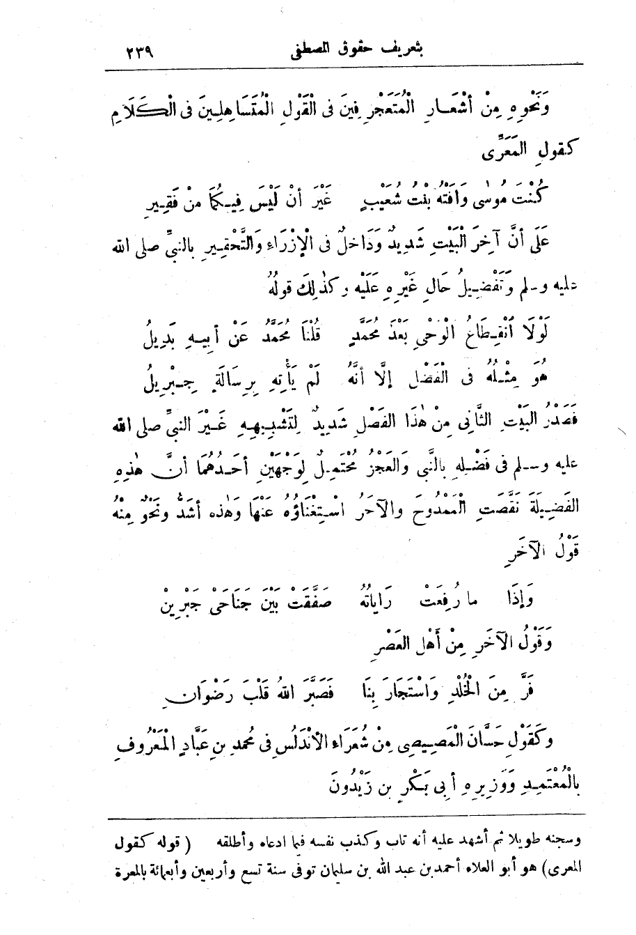 وَنَحْوَه من أشْعَار الْمُتَعَجْرِفِين فِي الْقَوْل الْمُتَسَاهِلِين فِي الْكَلَام كقول المَعَرّي كُنْت مُوسَى وَافَتْه بِنْت شُعَيْب * غَيْر أن لَيْس فِيكُمَا من فَقِير