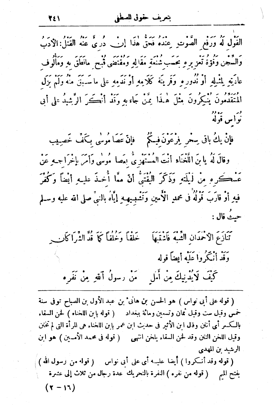 (قوله عَلَى أَبِي نواس) هو الحسن بن هانئ بن عبد الأول بن الصباح توفى سنة خمس وقيل ست وقيل ثمان وتسعين ومائة ببغداد (قوله يا بن اللخناء) لخن السقاء بالسر أي أنتن وقال ابن الأثير في حديث ابن عمر يا بن اللخناء هي المرأة التى لم تختن وقيل اللخن النتن وقد لخن السقاء يلخن انتهى (قَوْله فِي مُحَمَّد الأمين) هو ابن الرشيد بن المهدى (قوله وقد أنكروا) أيضا عليه أي عَلَى أَبِي نواس (قوله من رسول الله) بفتح الميم (قوله من نفره) النفرة بالتحريك عدة رجال من ثلاث إلى عشرة (16 - 2) (*)