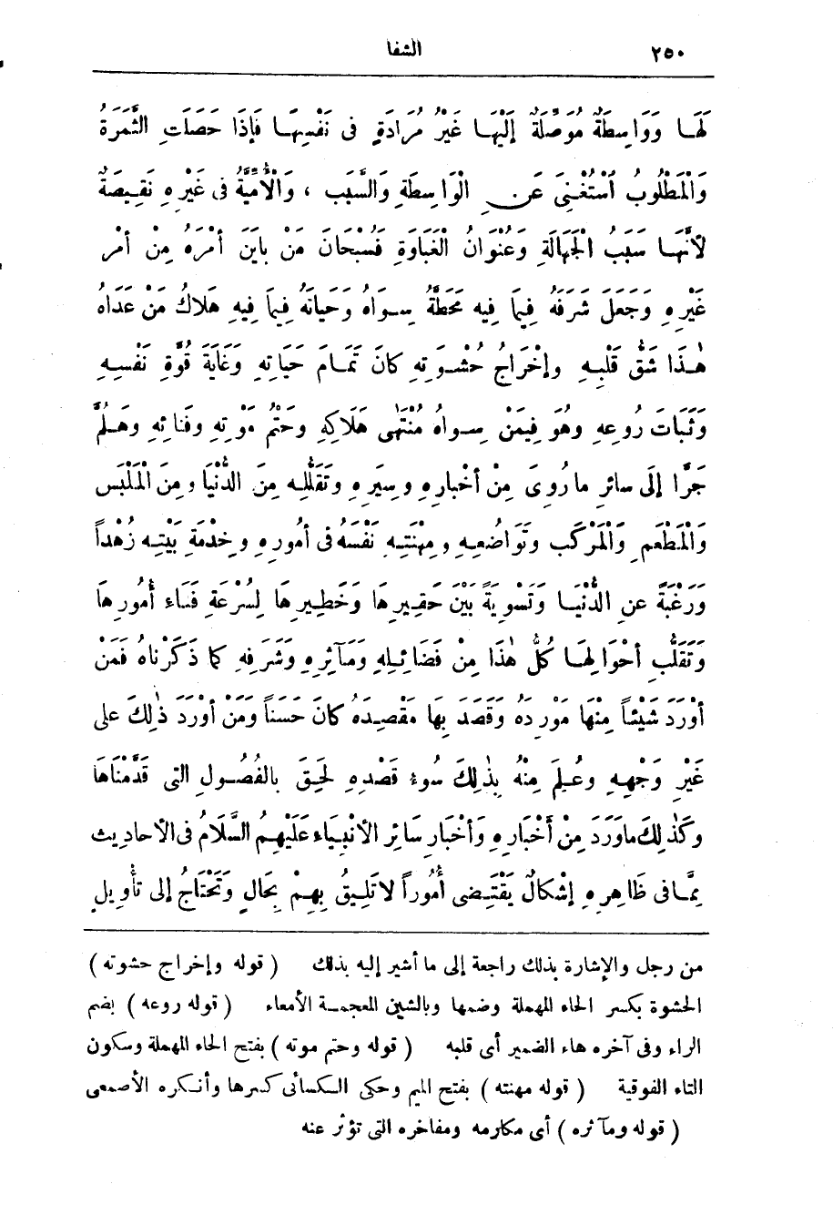 لَهَا وَوَاسِطَة مُوَصّلة إِلَيْهَا غَيْر مُرَادَة فِي نَفْسِهَا فَإِذَا حَصَلَت الثَّمْرَة وَالمَطْلُوب اسْتُغْنِي عَن الْوَاسِطَة وَالسّبَب، وَالْأُمّيَّة فِي غَيْرِه نَقِيصَة لِأَنّهَا سَبَب الْجَهَالَة وَعُنْوَان الْغَبَاوَة فَسُبْحَان من بايَن أمْرَه من أمْر غَيْرِه وَجَعَل شَرَفَه فِيمَا فِيه محطة سواه وحياته فِيمَا فِيه هلاك من عداه هَذَا شَقّ قلبه وإخْرَاج حُشْوَتِه كَان تَمَام حَيَاتِه وَغَايَة قوة نفسه وثبات روعه وَهُو فِيمَن سواه منتهى هلاكه وحتم موته وفنائه وهلم جَرّا إِلَى سائر مَا رُوِي من أخباره وسيره وتقلله مِن الدُّنْيَا وَمِن الملبس