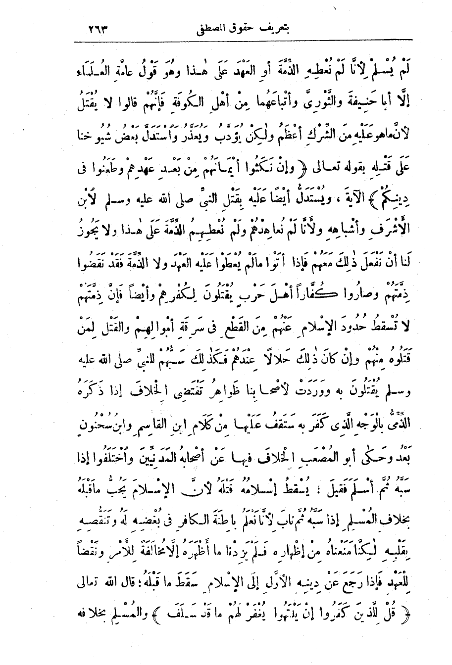 لِأَنّ مَا هُو عَلَيْه مِن الشّرْك أعظم وَلَكِن يُؤْدّب ويعذر واسْتَدَلّ بَعْض شُيُوخنا عَلَى قَتْلِه بِقَوْلِه تَعَالَى (وَإِنْ نَكَثُوا أَيْمَانَهُمْ مِنْ بَعْدِ عَهْدِهِمْ وَطَعَنُوا فِي دينكم) الآيَة، وَيُسْتَدَلّ أيْضًا عَلَيْه بِقَتْل النَّبِيّ صَلَّى اللَّه عَلَيْه وَسَلَّم لابن الأشْرَف وأشْباهِه ولأنَّا لَم نُعاهِدْهُم وَلَم نُعْطِهِم الذَّمّة عَلَى هَذَا وَلَا يَجُوز لَنَا أن نَفْعَل ذَلِك مَعَهُم فَإِذَا أتَوْا مَا لَم يُعْطَوْا عَلَيْه العَهْد وَلَا الذّمَّة فَقَد نَقَضُوا ذِمَّتَهُم وصارُوا كُفّارًا أَهْل حَرْب يُقْتَلُون لِكُفْرِهِم وأيضًا فَإِنّ ذِمَّتَهُم لَا تُسْقط حُدود الْإِسْلَام عَنْهُم مِن القَطْع فِي سَرِقَة أمْوالِهِم والقَتْل لِمَن قَتَلُوه مِنْهُم وَإِنّ كَان ذَلِك حلالًا عندهم فكذلك سبهم للنبي صَلَّى اللَّه عَلَيْه وَسَلَّم يقتلون بِه ووردت لأصحابنا ظواهر تقتضي الخِلَاف إذَا ذكره الذمي بالوجه الَّذِي كفر بِه ستقف عَلَيْهَا من كَلَام ابن الْقَاسِم وَابْن سُحْنُون بَعْد وَحَكَى أَبُو المصعب الخِلَاف فِيهَا عَن أصحابه المدنيين واختلفوا إذَا سبه ثُمّ أسلم فَقِيل، يسقط إسلامه قتله لِأَنّ الْإِسْلَام يجب مَا قبله بخلاف المسلم إذَا سبه ثم ناب لأنا نعلم باطنة الكافر فِي بغضه لَه وتنقصه بقلبه لكنا منعناه من إظهاره فَلَم يزدنا مَا أظهره إلَّا مخالفة للأمر ونقضًا للعهد فَإِذَا رجع عَن دينه الأوّل إِلَى الْإِسْلَام سقط مَا قبله، قَال اللَّه تَعَالَى (قُلْ لِلَّذِينَ كَفَرُوا إِنْ يَنْتَهُوا يُغْفَرْ لَهُمْ مَا قَدْ سَلَفَ) والمُسْلِم بخلافه