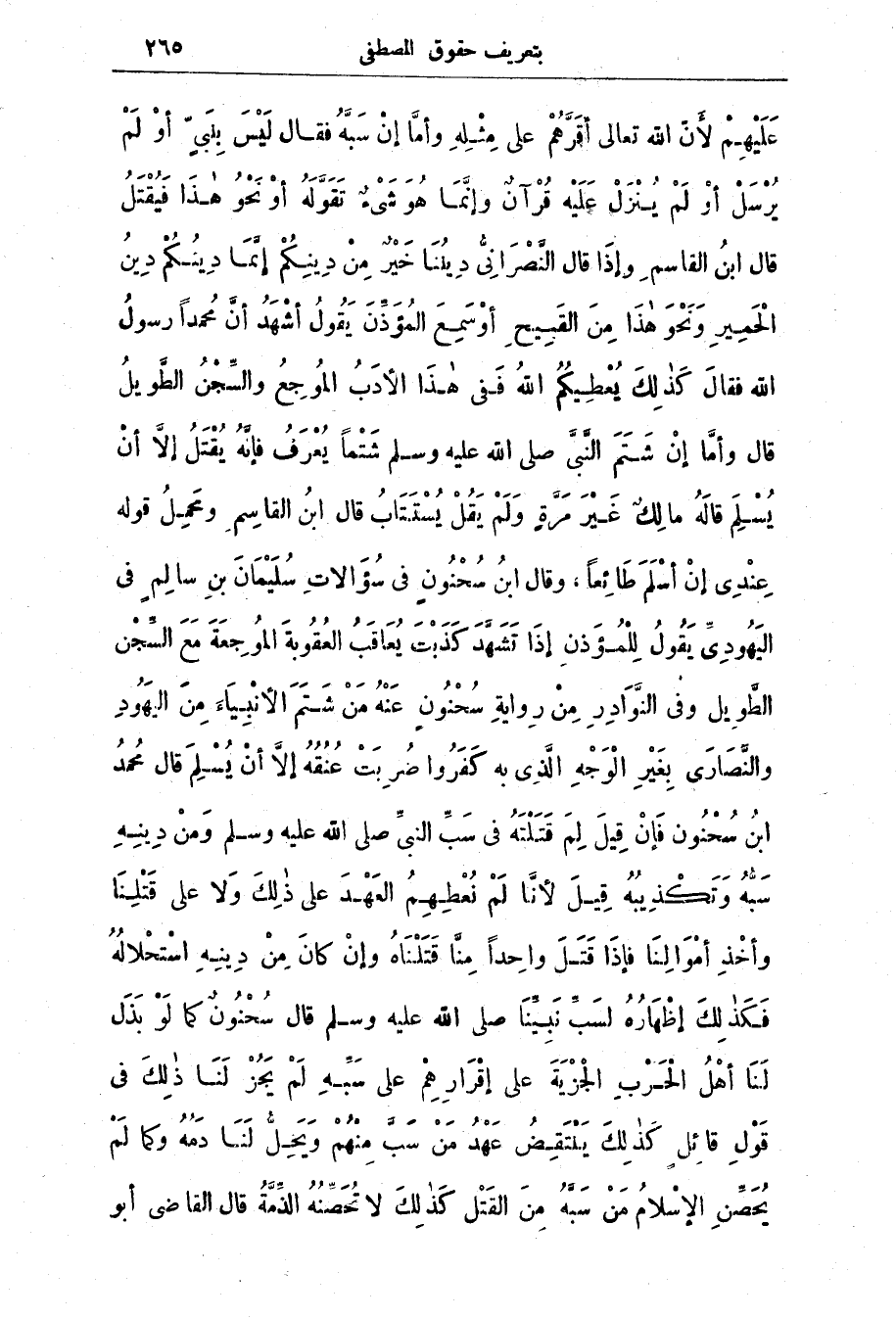 عَلَيْهِم لِأَنّ اللَّه تَعَالَى أقَرَّهُم عَلَى مِثْله وَأَمَّا إن سَبَّه فَقَال لَيْس بِنَبِيّ أَو لَم يُرْسَل أَو لَم يُنْزَل عَلَيْه قُرْآن وإنما هو شئ تقوله أَو نَحْو هَذَا فَيُقْتَل قَال ابن الْقَاسِم وَإذَا قَال النَّصْرَانِيّ دِينُنَا خَيْر من دِينِكُم إنَّمَا دِينُكُم دِين الْحَمِير ونحو هَذَا مِن القبيح أَو سَمِع المؤذن يَقُول أشهد أَنّ مُحَمَّدًا رَسُول اللَّه فَقَال كَذَلِك يعطيكم اللَّه ففي هَذَا الأدب المُوجِع والسَّجْن الطويل قَال وَأَمَّا إن شَتَم النَّبِيّ صَلَّى اللَّه عَلَيْه وَسَلَّم شَتْمًا يُعْرَف فَإنَّه يقتل إلَّا أَن يُسْلِم قاله مَالِك غَيْر مَرَّة وَلَم يقل يستتاب قَال ابن الْقَاسِم ومحمل قَوْله عِنْدِي إن أسلم طائعًا، وَقَال ابن سُحْنُون فِي سؤالات سُلَيْمَان بن سالم فِي