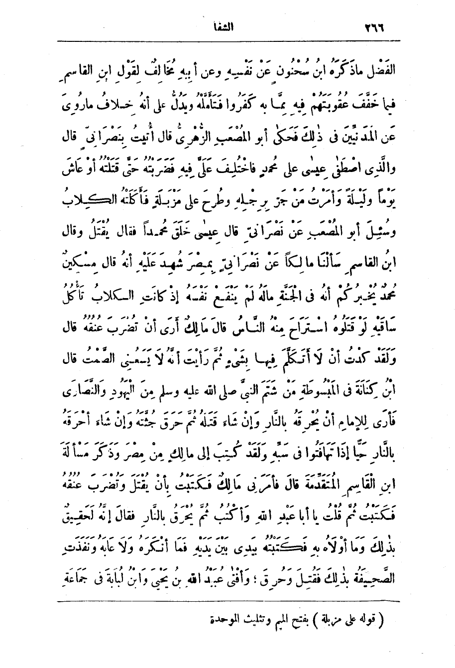 الْفَضْل مَا ذَكَرَه ابن سُحْنُون عَن نفسه وَعَن أَبِيه مُخَالِف لِقَوْل ابن الْقَاسِم فِيمَا خفَّف عُقُوبَتَهُم فِيه مِمَّا بِه كَفُروا فَتَأمّلْه وَيَدُلّ عَلَى أنَّه خِلَاف مَا رُوِي عَن المدنيين فِي ذَلِك فحَكى أَبُو المُصْعَب الزُّهْرِيّ قَال أُتيت بِنَصْرَانِيّ قَال والذي اصْطَفَى عِيسَى عَلَى مُحَمَّد فاخْتُلِف عَلَيّ فِيه فَضَربْتُه حَتَّى قَتَلْتُه أَو عَاش يَوْمًا وَلَيْلَة وأمَرْت من جر بِرِجْلِه وطُرح عَلَى مزْبَلَة فَأَكَلَتْه الكلاب وسئل أَبُو المصعب عَن نصراني قَال عِيسَى خلق مُحَمَّدًا فَقَال يُقْتَل وَقَال ابن الْقَاسِم سَألنا مالكًا عَن نَصْرَانِيّ بِمِصْر شُهِد عَلَيْه أنَّه قَال مِسْكِين مُحَمَّد يُخبرُكُم أنَّه فِي الجنة ماله لم ينفع نَفْسَه إِذ كَانَت الكلاب تَأْكُل سَاقَيْه لَو قَتَلُوه اسْتَرَاح مِنْه النَّاس قَال مَالِك أرَى أَن تُضْرَب عُنُقُه قَال وَلَقَد كدت أن لَا أتكلم فِيهَا بشئ ثُمّ رَأَيْت أنَّه لَا يسعني الصمت قَال ابن كنانة فِي المبسوطة من شتم النَّبِيّ صَلَّى اللَّه عَلَيْه وَسَلَّم مِن الْيَهُود والنّصَارَى