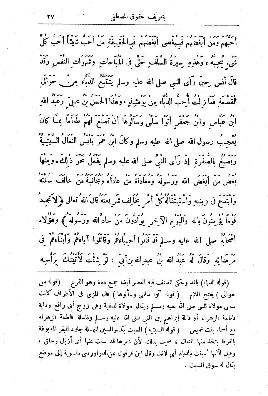 شئ يحبه) وهذه سِيرةُ السَّلَفِ حَتَّى في الْمُبَاحَاتِ وَشَهَوَاتِ النَّفْسِ وَقَدْ قَالَ أَنَسٌ حِينَ رَأى النَّبِيّ صَلَّى اللَّهُ عَلَيْهِ وَسَلَّمَ يَتَتَبَّعُ الدُّبّاءَ من حَوَالي الْقَصْعَةِ فَمَا زِلْتُ أُحِبُّ الدُّبَّاء من يَوْمَئِذٍ، وَهَذَا الْحَسَنُ بن عَلِيٍّ وَعَبد الله ابن عَبَّاسٍ وَابْنُ جَعْفَرِ أتَوْا سَلَمى وَسَألُوهَا أنْ تَصْنَعَ لَهُمْ طَعَامًا مِمَّا كَانَ يُعْجِبُ رَسُولَ اللَّه صَلَّى اللَّهُ عَلَيْهِ وَسَلَّمَ وَكَانَ ابن عُمَرَ يَلْبَسُ النّعَال السَّبْتِيَّة وَيصْبُغُ بالصُّفْرَةِ إِذْ رَأَى النَّبِيّ صَلَّى اللَّهُ عَلَيْهِ وَسَلَّمَ يَفْعَلُ نَحْو ذَلِكَ * وَمِنْهُا بُغْضُ من أبْغَضَ اللَّه وَرَسُولهُ وَمُعَادَاةُ من عَادَاهُ وَمُجَانَبَةُ من خَالَفَ سُنَّتَهُ وَابْتَدَعَ فِي دِينِهِ وَاسْتِثْقَالُهُ كُلَّ أمر يُخَالِف شَرِيعَتَهُ قَالَ الله تعالى (لا نجد قَوْمًا يُؤْمِنُونَ بِاللَّهِ وَالْيَوْمِ الآخِرِ يُوَادُّونَ مَنْ حَادَّ اللَّهَ ورسوله) وَهَؤْلَاءِ أصْحَابُهُ صَلَّى اللَّهُ عَلَيْهِ وَسَلَّمَ قَدْ قَتَلُوا أحِبَّاءَهُمْ وَقَاتَلُوا آباءَهُمْ وَأبْنَاءَهُمْ فِي مَرْضَاتِهِ وَقَالَ لَهُ عَبْد اللَّه بنُ عَبْد اللَّه بن أبي: لَوْ شِئْتَ لأتَيْتُكَ بِرَأْسِهِ