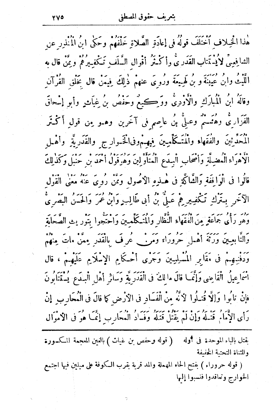 بقتل بالباء الموحدة في أوله (قوله وحفص بن غياث) بالغين المعجمة المكسورة والمثناة التحتية الخفيفة (قوله حروراء) بفتح الحاء المهملة والمد قرية بقرب الكوفة على ميلين فيها اجتمع الخوارج وتعاقدوا فنسبوا إليها (*)