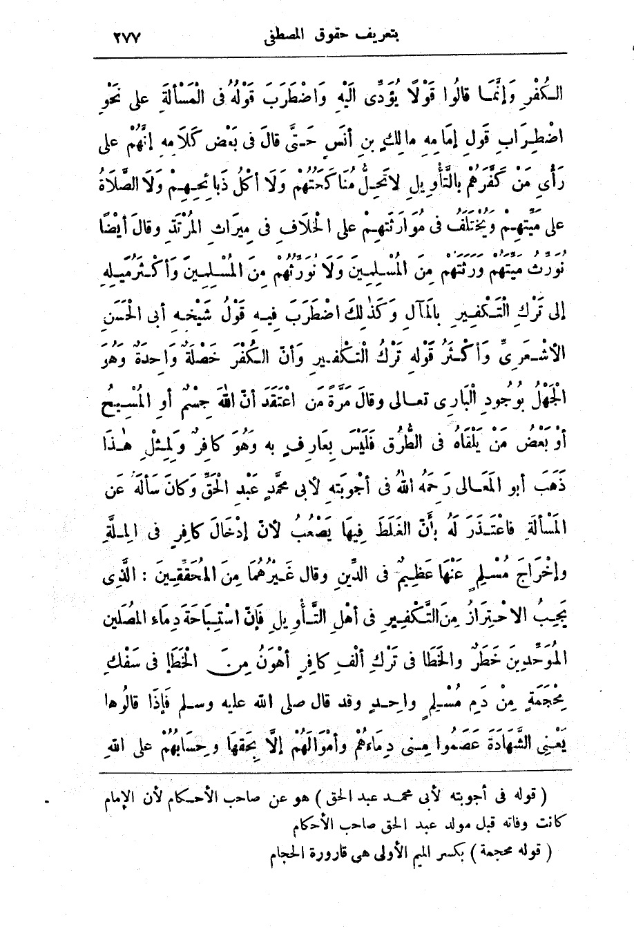 الكُفْر وَإِنَّمَا قَالُوا قَوْلًا يُؤَدّي إليْه واضطرب قَوْلِه فِي المسألة عَلَى نَحْو اضْطِرَاب قَوْل إمامه مَالِك بن أَنَس حَتَّى قاله فِي بَعْض كَلَامه إنَّهُم عَلَى رَأْي من كَفّرَهُم بالتَّأْويل لَا تَحِلّ مُنَاكَحَتُهُم وَلَا أكْل ذَبَائِحِهم وَلَا الصَّلَاة عَلَى مَيّتِهِم وَيُخْتَلف فِي مُوَارَثَتِهِم عَلَى الخِلَاف فِي ميراث المُرْتَد وقال أيضا نورث ميتهم ورثتهم مِن الْمُسْلِمِين وَلَا نورثهم من المسلمين وأكثر ميله إلى ترك التّكْفِير بالمَآل وَكَذَلِك اضْطَرَب فِيه قَوْل شَيْخِه أَبِي الْحَسَن الْأَشْعَرِيّ وَأكْثَر قَوْلِه تَرْك التكْفِير وَأَنّ الكُفْر خَصْلَة وَاحِدَة وَهُو الْجَهْل بِوُجُود الْبَارِي تَعَالَى وَقَال مَرَّة مِن اعْتَقَد أَنّ اللَّه جِسْم أو المسِيح أَو بَعْض من يَلْقَاه فِي الطُّرُق فليس بِعَارِف بِه وَهُو كَافِر وَلِمِثْل هَذَا ذَهَب أَبُو المعالي رَحِمَه اللَّه فِي أجْوبَتِه لأبي مُحَمَّد عَبْد الْحَقّ وَكَان سَألَه عَن المَسْألة فاعْتَذَر لَه بأن الغَلَط فِيهَا يَصْعُب لِأَنّ إدْخَال كافِر فِي المِلّة وَإخْرَاج مُسْلِم عَنْهَا عَظِيم فِي الدّين وقال غَيْرُهُمَا مِن المُحَقّقِين: الَّذِي يَجِب الاحْتِرَاز مِن التّكْفِير فِي أَهْل التَّأْوِيل فَإِنّ اسْتِبَاحَة دِمَاء المُصَلّين المُوَحّدِين خَطَر والخَطَأ فِي تَرْك ألْف كافِر أهْون مِن الخَطَإ فِي سَفْك مَحْجَمَة من دم مُسْلِم وَاحِد وَقَد قَال صَلَّى اللَّه عَلَيْه وَسَلَّم فَإِذَا قَالُوهَا يَعْنِي الشَّهَادَة عَصَمُوا مِنِّي دِمَاءَهُمْ وأموالهم إلا بححقها وَحِسَابُهُمْ عَلَى اللَّهِ