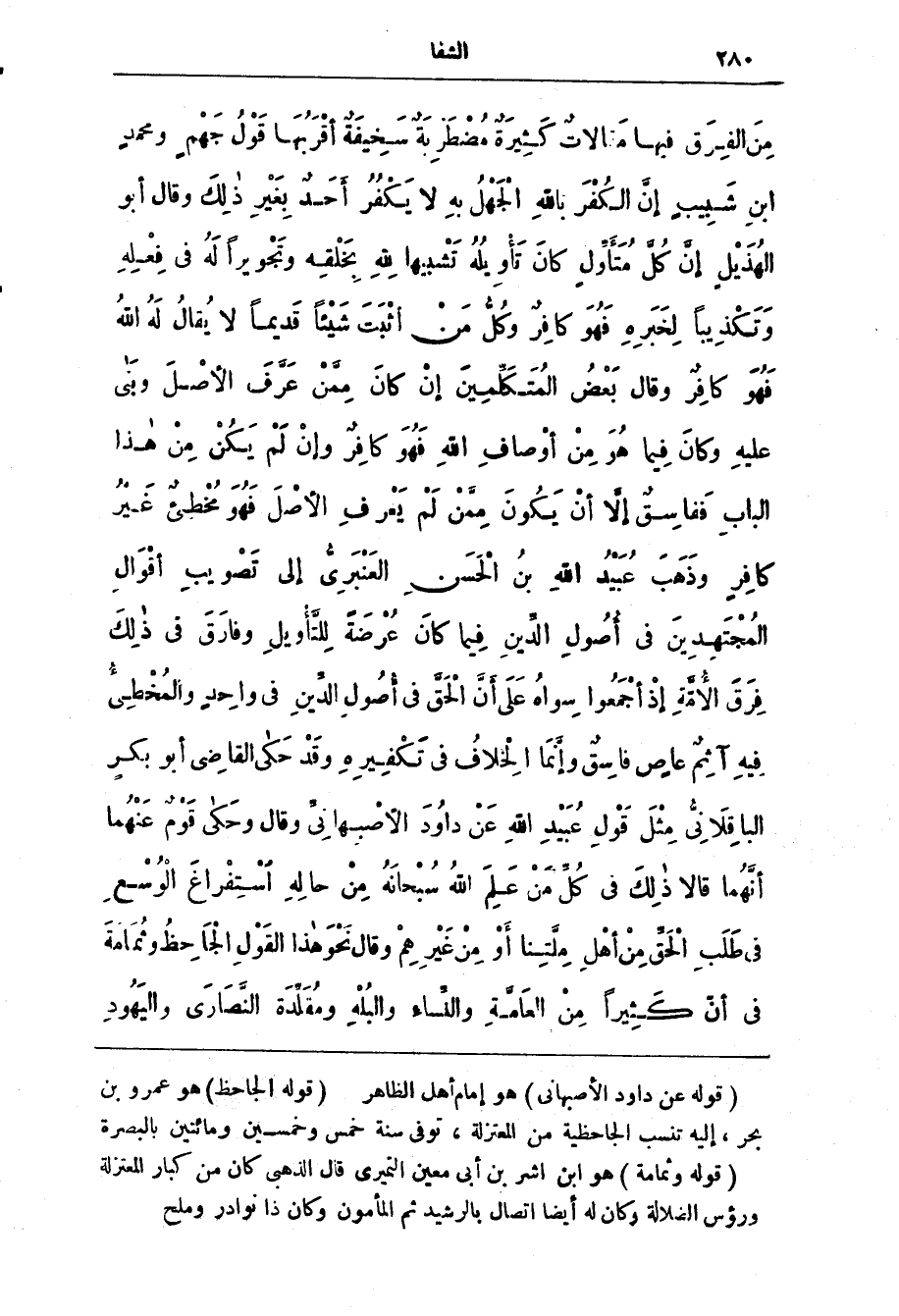 (قوله عَن دَاوُد الأَصْبَهَانِيّ) هو إمام أهل الظاهر (قوله الجاحظ) هو عمرو بن بحر، إليه تنسب الجاحظية من المعتزلة، توفى سنة خمس وخمسين ومائتين بالبصرة (قوله وثمامة) هو ابن اشر بن أبى معين التميرى قال الذهبي كان من كبار المعتزلة ورؤس الضلالة وكان له أيضا اتصال بالرشيد ثم المأمون وكان ذا نوادر وملح (*)
