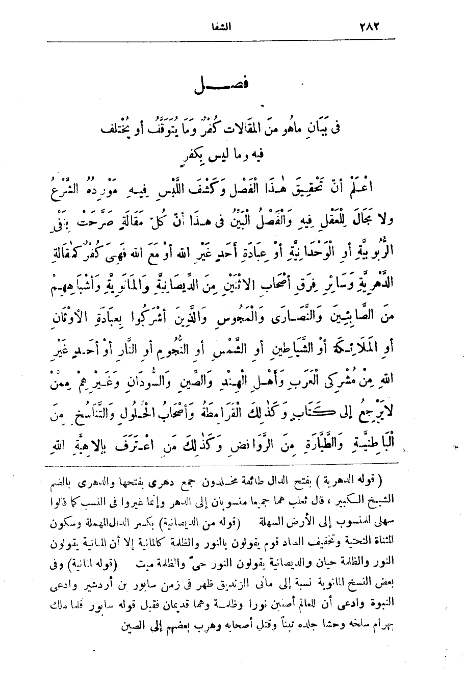 فصل فِي بيان مَا هُو مِن المقالات كفر وَمَا يتوقف أَو يختلف فِيه وَمَا لَيْس بكفر اعْلَم أَنّ تحْقيق هَذَا الْفَصْل وكَشْف اللّبْس فِيه مَوْرِدُه الشَّرْع وَلَا مجَال لِلْعَقْل فِيه والفصل البَيّن فِي هَذَا أَنّ كُلّ مَقَالَة صَرّحَت بِنَفْي الرُّبُوبيّة أَو الْوَحْدَانِيّة أَو عِبَادة أحد غَيْر اللَّه أَو مَع اللَّه فهي كُفْر كَمَقَالَة الدَّهْرِيّة وَسَائِر فِرَق أَصْحَاب الاثْنَيْن مِن الدّيصَانِيّة وَالمَانَوِيّة وأشْبَاهِهِم مِن الصّابِئِين وَالنَّصَارَى وَالمَجُوس وَالَّذِين أشركوا بعبادة الأوثان أَو الْمَلَائِكَة أَو الشيطاين أَو الشمس أَو النجوم أَو النَّار أَو أحد غَيْر اللَّه من مُشْركي الْعَرَب وَأَهْل الهنْد والصّين والسُّودَان وَغَيْرِهِم مِمَّن لَا يَرْجع إِلَى كِتَاب وَكَذَلِك القَرَامِطة وَأَصْحَاب الحُلُول والتّنَاسُخ مِن الباطِنّية وَالطّيَارَة مِن الرّوَافض وَكَذَلِك مِن اعْتَرَف بإلاهيّة الله