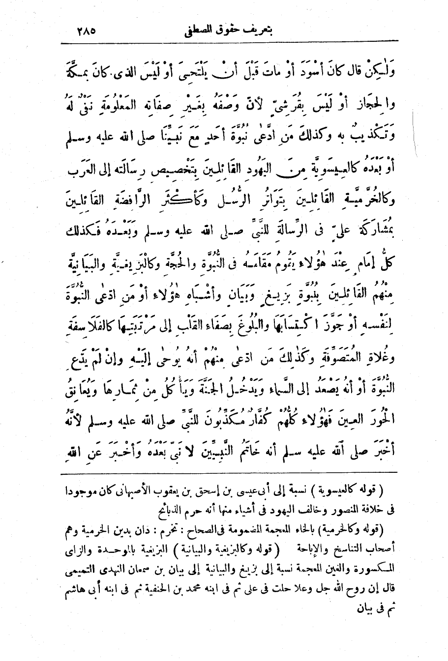 وَلَكِن قَال كَان أسْوَد أَو مات قَبْل أن يلتحي أَو لَيْس الَّذِي كَان بمكّة والحجاز أَو لَيْس بقرشي لِأَنّ وصفه بغير صفاته المعلومة نفي لَه وتكذيب بِه وَكَذَلِك من ادعى نُبُوَّة أَحَد مَع نبينا صَلَّى اللَّه عَلَيْه وَسَلَّم أَو بَعْدَه كالعيسوية مِن اليَهُود القائلين بتخصيص رسالته إِلَى الْعَرَب وكالخرمية القائلين بتواتر الرُّسُل وكأكثر الرافضة القائلين بمشاركة عَلِيّ فِي الرسالة للنبي صَلَّى اللَّه عَلَيْه وَسَلَّم وَبَعْدَه فكذلك كُلّ إمام عِنْد هَؤْلَاء يقوم مقامه فِي النُّبُوَّة والحَجَّة وكالْبَزيغيّة والبَيَانِيّة مِنْهُم القَائِلِين بِنُبُوَّة بِزِيغ وَبَيَان وَأشْبَاه هَؤْلَاء أَو من ادّعى النُّبُوَّة لِنَفْسِه أَو جوّز اكْتِسَابَهَا والبُلُوغ بِصَفَاء القَلْب إلى مَرْتَبَتِهَا كالفَلَاسِفَة وغُلاة المُتَصَوّفَة وَكَذَلِك مَن ادّعى مِنْهُم أنَّه يوحى إليْه وإن لَم يدَّع النُّبُوَّة أَو أنَّه يَصْعَد إِلَى السَّمَاء وَيَدْخُل الْجنة وَيَأْكُل من ثِمَارِهَا وَيُعَانِق