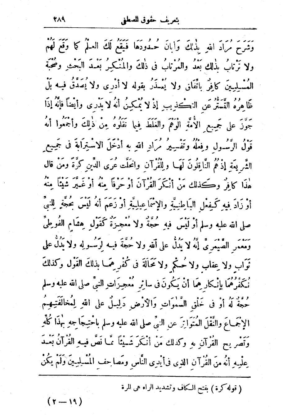 وَشَرَح مُرَاد اللَّه بِذَلِك وَأبان حُدُودَهَا فَيَقَع لَك العلْم كَمَا وَقَع لَهُم وَلَا تَرْتاب بِذَلِك بَعْد والمرتاب فِي ذَلِك والمنكر بَعْد البحث وصحبته الْمُسْلِمِين كافر باتفاق وَلَا يعذر بِقَوْلِه لَا أدري وَلَا يصدق فِيه بَل ظاهره التستر عَن التكذيب إِذ لَا يمكن أنَّه لَا يدري وأيضا فَإنَّه إذَا جوز عَلَى جميع الْأُمَّة الوهم والغلط فِيمَا نقلوه من ذَلِك وأجمعوا أنَّه قَوْل الرَّسُول وفعله وتفسير مراد اللَّه بِه أدخل الاسترابة فِي جميع الشريعة إِذ هُم الناقلون لَهَا وللقرآن وانحلت عرى الدّين كرة وَمَن قال هَذَا كافر وَكَذَلِك من أنكر الْقُرْآن أَو حرفا مِنْه أَو غَير شَيْئًا مِنْه أَو زاد فِيه كفعل الباطنية والإسماعيلية أَو زعم أنَّه لَيْس بحجة للنبي صَلَّى اللَّه عَلَيْه وَسَلَّم أَو لَيْس فِيه حجة وَلَا مُعْجِزَة كقول هِشَام الفوطي ومعمر الصيمري إنَّه لَا يدل عَلَى اللَّه وَلَا حجة فيها لرسوله وَلَا يَدُلّ عَلَى ثَوَاب وَلَا عِقَاب وَلَا حُكْم وَلَا مَحَالَة فِي كُفْرِهِمَا بِذَلِك القَوْل وَكَذَلِك نُكَفرهُما بإنْكارِهِمَا أن يَكُون فِي سائِر مُعْجِزَات النَّبِيّ صَلَّى اللَّه عَلَيْه وَسَلَّم حجة لَه أَو فِي خلق السَّمَوَات والأرض دَليل على الله لمخالفهتهم الإجْماع والنّقْل المُتَوَاتِر عَن النَّبِيّ صَلَّى اللَّه عَلَيْه وَسَلَّم باحْتِجَاجِه بَهَذَا كُله وَتَصْرِيح الْقُرْآن بِه وَكَذَلِك من أنكر شَيْئًا مِمَّا نص فِيه الْقُرْآن بَعْد علمه أنَّه من الْقُرْآن الَّذِي فِي أيدي النَّاس ومصاحف لمسلمين ولم يكن