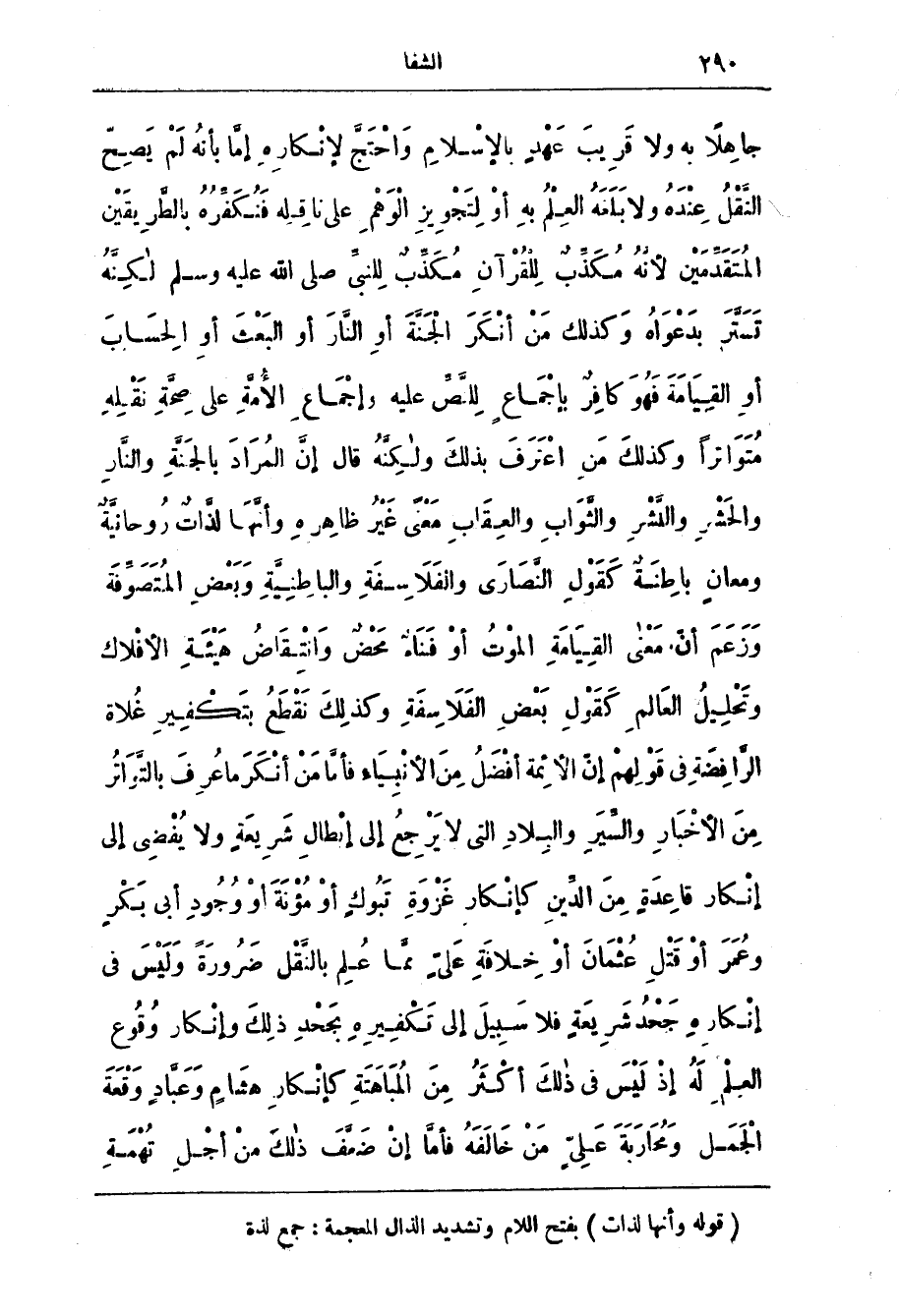 جاهلًا بِه وَلَا قريب عهد بالْإِسْلَام واحْتَجّ لإنْكاره إِمَّا بأنه لم يصبح النّقْل عِنْدَه وَلَا بَلَغَه الْعِلْم بِه أَو لِتَجْوِيز الْوَهْم على نافله فنتكفره بالطريقين المتقدمين لِأَنَّه مُكَذّب للقرآن مُكَذّب للنبي صَلَّى اللَّه عَلَيْه وَسَلَّم لكنه تَسَتّر بدَعْوَاه وَكَذَلِك من أنْكَر الْجَّنة أَو النَّار أَو البَعْث أَو الحساب أو القيامة فهو كافِر بإجْماع لِلنصّ عَلَيْه وإجْماع الْأُمَّة عَلَى صِحّة نَقْله مُتَوَاترًا وَكَذَلِك من اعْتَرَف بِذَلِك ولكنه قَال إنّ المراد بالجنة والنار والحشر والنشر والثواب والعقاب مَعْنَي غَيْر ظاهره وَأنَّهَا لذات روحانية ومعان باطنة كقول النَّصَارَى والفلاسفة والباطنية وبعض المتصوفة وزعم أن مَعْنَي الْقِيَامَة الموت أو فناه محض ولتنقاض هيئة الأفلاك وتحليل العالم كقول بَعْض الفلاسفة وَكَذَلِك نقطع بتكفير غلاة الرافضة فِي قولهم إنّ الْأَئِمَّة أفضل مِن الْأَنْبِيَاء فَأَمَّا من أنكر مَا عرف بالتواتر مِن الْأَخْبَار والسير والبِلاد الَّتِي لَا يَرْجع إلى إبْطال شَرِيعة وَلَا يُفْضِي إِلَى إنْكار قاعِدَة مِن الدّين كإنكْار غزوة تبوك أو مؤنة أَو وجود أَبِي بَكْر وعمر أَو قتل عثمان أَو خلافه عَلِيّ مِمَّا علم بالنقل ضرورة وليس في إنكار وجحد شَرِيعة فَلَا سَبِيل إلى تَكْفِيرِه بِجحْد ذَلِك وإنكار وُقُوع الْعِلْم لَه إِذ لَيْس فِي ذَلِك أكْثَر مِن المُبَاهَتَة كإنْكار هِشَام وَعَبّاد وَقْعَة الجَمَل ومُحَارَبَة عَلِيّ من خَالفَه فَأَمَّا إن ضَعّف ذَلِك من أجل تهمة