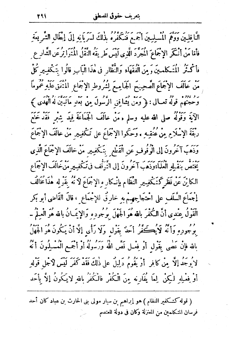 فأكثر المتكلمين وَمِن الفُقَهَاء والنظار فِي هَذَا الْبَاب قَالُوا بتكفير كُلّ من خالف الإجماع الصحيح الجامع لشروط الإجماع المتفق عَلَيْه عمومًا وحجتهم قَوْله تَعَالَى: (وَمَنْ يُشَاقِقِ الرَّسُولَ مِنْ بَعْدِ مَا تَبَيَّنَ لَهُ الهدى) الآية وَقَوْلُه صَلَّى اللَّه عَلَيْه وَسَلَّم (مَنْ خَالَفَ الْجَمَاعَةَ قِيدَ شِبْرٍ فَقَدْ خَلَعَ رَبْقَةَ الْإِسْلَامِ مِنْ عُنُقُهِ) وحكوا الإجْمَاع عَلَى تَكْفِير من خالف الإجْماع وَذَهَب آخَرُون إِلَى الْوُقُوف عَن الْقَطْع بِتَكْفِير من خَالَف الإجْماع الَّذِي يَخْتَصّ بِنَقْلِه الْعُلمَاء وذهب آخَرُون إِلَى التَّوَقُّف فِي تَكْفِير من خَالَف الإجْمَاع الكائِن عَن نظَر كتَكْفِير النَّظّام بإنْكارِه الإجْماع لِأَنَّه بِقَوْلِه هَذَا مُخَالِف إجْمَاع السَّلَف عَلَى احْتَجَاجِهِم بِه خارِق للإجْماع، قَال الْقَاضِي أَبُو بَكْر الْقَوْل عِنْدِي أَنّ الكُفْر بالله هُو الجَهْل بِوُجُودِه والإيمَان بالله هُو الْعِلْم - بوجوده وَأنَّه لَا يُكَفّر أَحَد بِقَوْل وَلَا رَأْي إلَّا أن يَكُون هُو الْجَهْل بالله فإن عَصى بِقَوْل أَو فِعْل نَصّ اللَّه وَرَسُولِه أو أجْمَع الْمُسْلِمُون أنَّه لَا يوجد إلَّا من كافِر أَو يَقُوم دَلِيل عَلَى ذَلِك فَقَد كَفَر لَيْس لأجْل قَوْله أَو فِعْلِه لَكِن لما يُقَارِنه مِن الكْفُر فالْكُفْر بالله لَا يَكُون إلَّا بأحَد