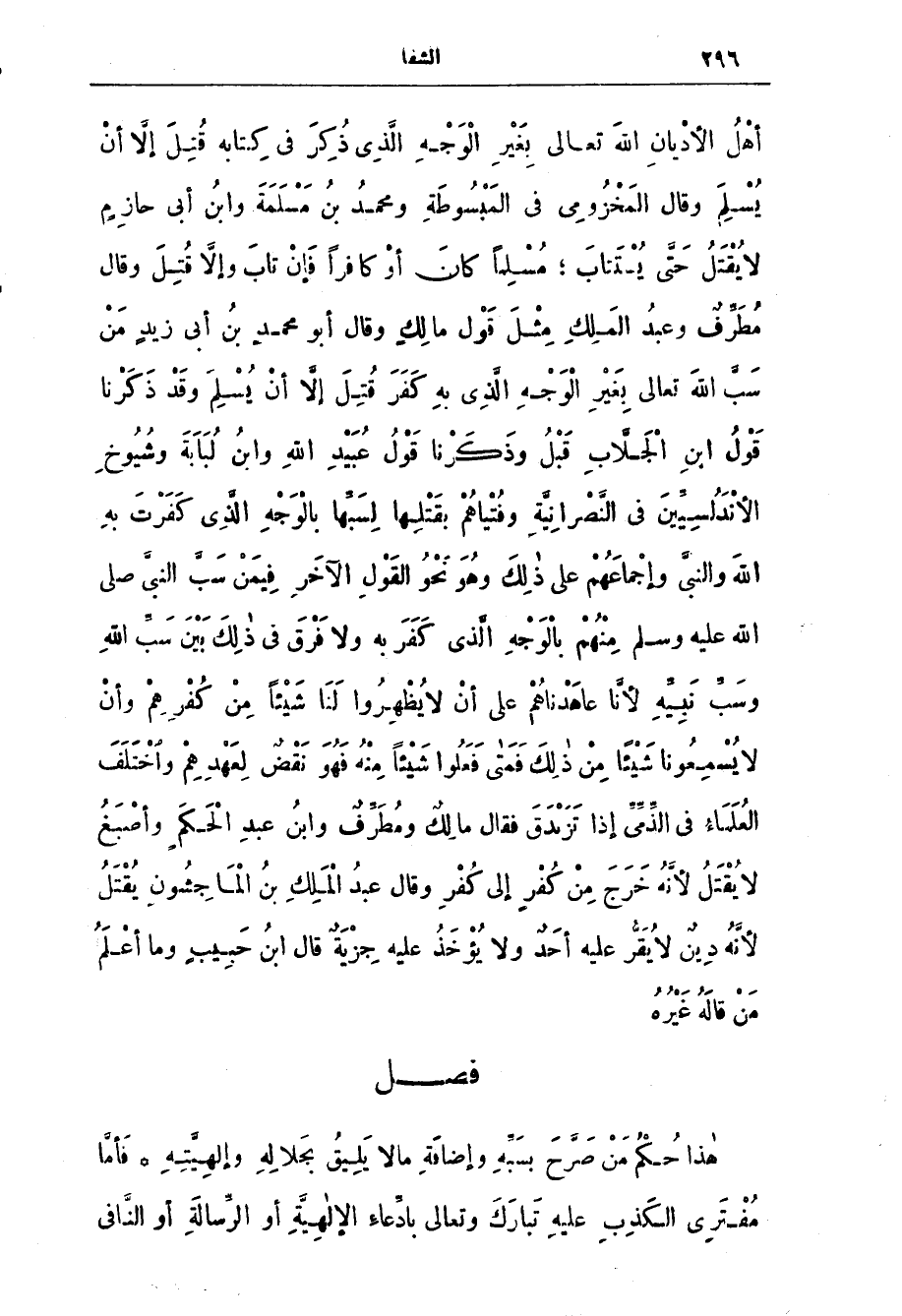 فصل هَذَا حُكْم من صَرَّح بِسَبّه وإضافة مَا لَا يَلِيق بِجَلالِه وإلهِيّتِه * فَأَمَّا مُفْتَرِي الكَذِب عَلَيْه تَبارَك وَتَعَالَى بادّعاء الإلهيّة أَو الرَّسالة أَو النَّافي