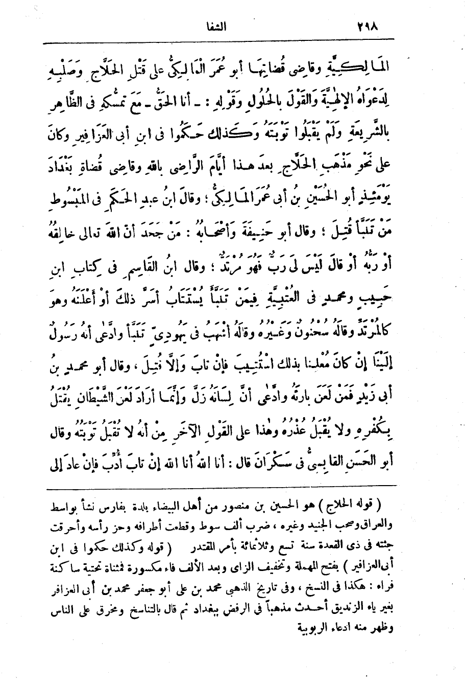 لِدَعْوَاه الإلهِيَّة والقول بالحُلُول وَقَوْلُه: - أَنَا الْحَقّ - مَع تمسُّكه فِي الظّاهِر بالشّرِيعَة وَلَم يَقْبَلُوا تَوْبَتَه وَكَذَلِك حَكَمُوا فِي ابن أَبِي العَزَافِير وَكَان عَلَى نَحْو مَذْهَب الحَلَّاج بَعْد هَذَا أيام الرّاضِي بالله وقاضي قُضاة بغداد يَوْمَئِذ أَبُو الْحُسَيْن بن أَبِي عُمَر المالكي، وَقَال ابن عَبْد الحَكَم فِي المبسوط من تَنَبَّأ قُتِل، وَقَال أَبُو حَنِيفَة وأصْحَابُه: من جَحَد أَنّ اللَّه تَعَالَى خالِقُه أَو رَبُّه أَو قَال لَيْس لِي رَبّ فَهُو مُرْتَد، وَقَال ابن الْقَاسِم فِي كِتَاب ابن حبيب وَمُحَمَّد فِي العُتْبيَّة فِيمَن تنبأ يستتاب أسَرّ ذَلِك أَو أعلنه وهو كالمرتد وقاله سحنون وغيره وقاله أشْهَب فِي يَهُودِيّ تَنَبَّأ وادّعى أنَّه رسول إِلَيْنَا إن كَان؟ ؟ ؟ ؟ ؟ بِذَلِك اسْتُتِيب فإن تاب وَإِلَّا قُتِل.