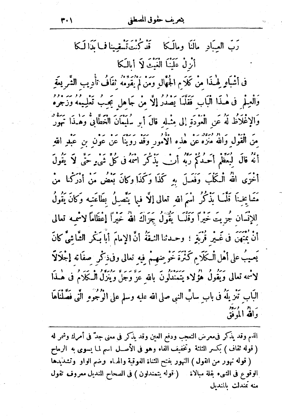 أنَّه قَال لِيُعَظّم أحَدُكُم رَبَّه أَن يُذْكَر اسْمُه فِي كل شئ حَتَّى لَا يَقُول أخْزَى اللَّه الْكَلْب وَفَعَل بِه كَذَا وكَذَا وَكَان بَعْض من أدْرَكْنا من مشايخنا فلما يَذْكُر اسم اللَّه تَعَالَى إلَّا فِيمَا يَتَّصِل بِطَاعَتِه وَكَان يَقُول للإنسان جُزيت خَيْرًا وَقَلَّمَا يَقُول جَزاك اللَّه خَيْرًا إعْظَامًا لاسْمِه تَعَالَى أَنّ يُمْتَهَن فِي غَيْر قُرْبَة، وحَدَّثَنَا الثقَة أَنّ الْإِمَام أَبَا بَكْر الشَّاشِيّ كَان يَعيب عَلَى أَهْل الْكَلَام كَثْرَة خَوْضِهِم فِيه تَعَالَى وَفِي ذكر صِفَاتِه إجْلالًا لاسْمه تَعَالَى يقول هَؤْلَاء يَتَمَنْدَلُون بالله عَزّ وَجَلّ وَيُنَزَّل الْكَلَام فِي هَذَا البَاب تَنْزيلَه فِي باب سابّ النَّبِيّ صَلَّى اللَّه عَلَيْه وَسَلَّم عَلَى الْوُجُوه الَّتِي فَصَّلْنَاهَا والله الموفق