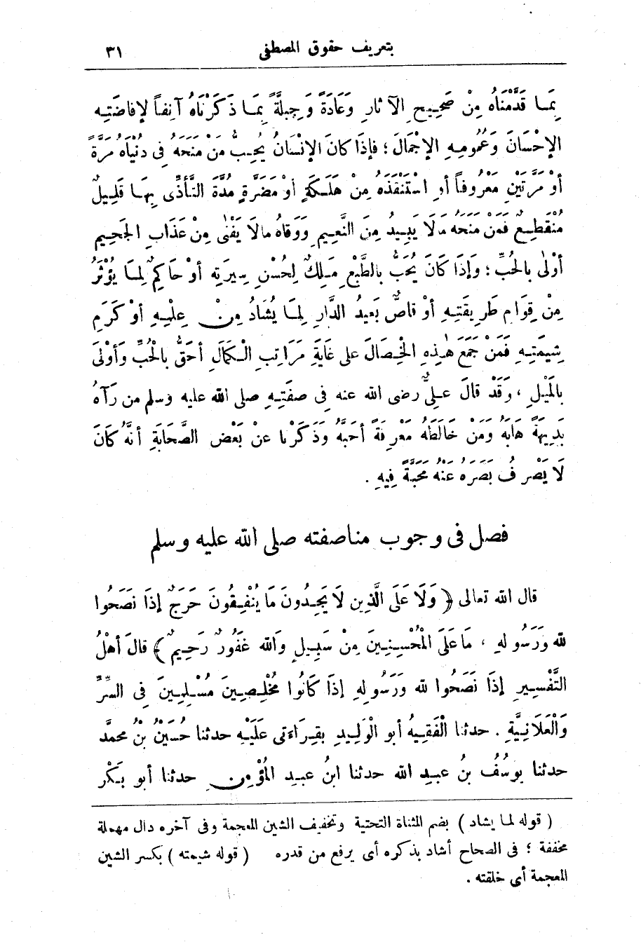 فصل فِي وجوب مناصفته صَلَّى اللَّهُ عَلَيْهِ وَسَلَّمَ قَالَ اللَّه تَعَالَى (وَلا عَلَى الَّذِينَ لا يَجِدُونَ مَا يُنْفِقُونَ حَرَجٌ إِذَا نَصَحُوا لِلَّهِ وَرَسُولِهِ، مَا عَلَى الْمُحْسِنِينَ مِنْ سَبِيلٍ وَاللَّهُ غَفُورٌ رَحِيمٌ) قَالَ أَهْلُ التَّفْسِيرِ إذَا نَصَحُوا لِلَّهِ وَرَسُولِهِ إِذَا كَانُوا مُخْلِصِينَ مُسْلِمِينَ فِي السّرّ والْعَلانَيَّة.