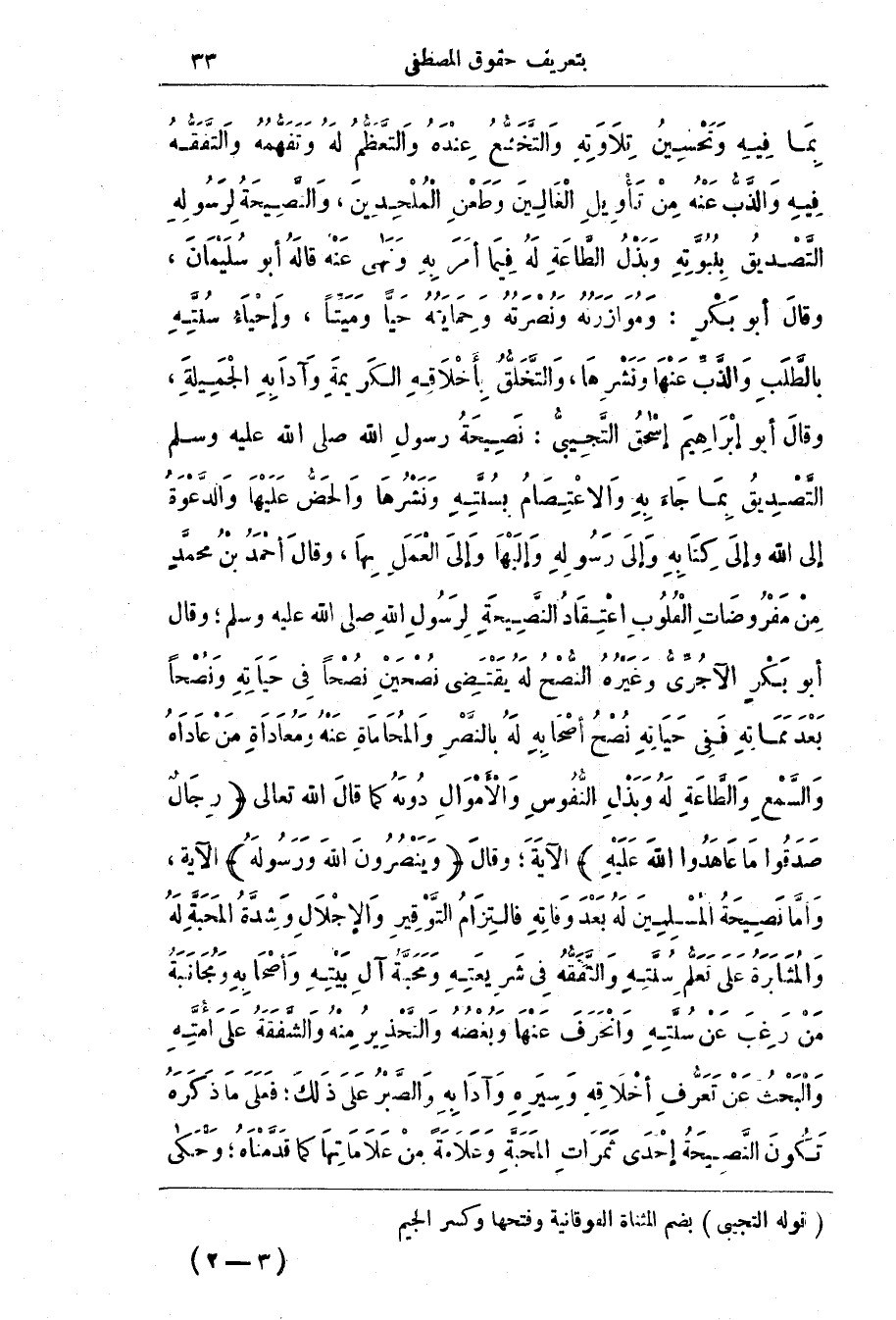 من مَفْرُوضَاتِ الْقُلُوبِ اعْتِقَادُ النَّصِيحَةِ لِرَسُولِ اللَّه صَلَّى اللَّهُ عَلَيْهِ وَسَلَّمَ، وَقَالَ أَبُو بَكْرٍ الآجُرّيُّ وَغَيْرُهُ النُّصْحُ لَهُ يَقْتَضِي نُصْحَيْنِ نُصْحًا فِي حَيَاتِهِ وَنُصْحًا بَعْدَ مَمَاتِهِ فَفِي حَيَاتِهِ نُصْحُ أَصْحَابِهِ لَهُ بِالنَّصْرِ وَالمُحَامَاةِ عَنْهُ وَمُعَادَاةِ من عَادَاهُ وَالسَّمْعِ وَالطَّاعَةِ لَهُ وَبَذْلِ النُّفُوسِ وأموال دُونَهُ كَمَا قَالَ الله تَعَالَى (رِجَالٌ صَدَقُوا مَا عَاهَدُوا اللَّهَ عَلَيْهِ) الآيَةَ، وَقَالَ (وَيَنْصُرُونَ الله ورسوله) الآيَةَ، وَأَمَّا نَصِيحَةُ الْمُسْلِمينَ لَهُ بَعْدَ وَفَاتِهِ فالتِزَامُ التَّوْقِيرِ وَالإجْلالِ وشِدَّةُ المَحَبَّة لَهُ وَالمُثَابَرَةُ عَلَى تعلم سنته والنفقة فِي شَرِيعَتِهِ وَمَحَبَّةُ آلِ بَيْتِهِ وأصْحَابِهِ وَمُجَانَبَةُ من رَغِبَ عَنْ سُنّتِهِ وَانْحَرَفَ عَنْهَا وَبُغْضُهُ وَالتَّحْذِيِرُ مِنْهُ وَالشَّفَقَةُ عَلَى أُمَّتِهِ وَالْبَحْثُ عَنْ تَعَرُّفِ أَخْلَاقِهِ وَسِيَرِهِ وَآدَابِهِ وَالصّبْرُ عَلَى ذَلِكَ: فَعَلَى مَا ذَكَرَهُ تَكُونُ النَّصِيحَةُ إحْدَى ثَمْراتِ المَحَبَّةِ وَعَلَامَةً من عَلَامَاتِهَا كَمَا قَدَّمْنَاهُ، وَحَكى (قوله التجيبى) بضم المثناة الفوقانية وفتحها وكسر الجيم (3 - 2) (*)