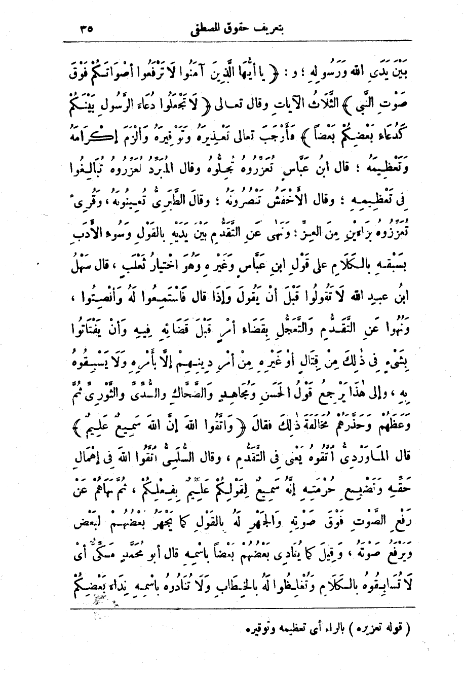 بَيْنَ يَدَيِ اللَّهِ ورسوله، و: (يا أيها الَّذِينَ آمَنُوا لا تَرْفَعُوا أَصْوَاتَكُمْ فَوْقَ صَوْتِ النبي) الثلاث آيات وَقَالَ تَعَالَى (لا تَجْعَلُوا دُعَاءَ الرَّسُولِ بَيْنَكُمْ كَدُعَاءِ بَعْضِكُمْ بعضا) فأوجب تعالى تعذيره وَتَوْقِيرَهُ وَألْزَمَ إكْرَامَهُ وتعظيمه، وقال ابن عَبَّاس تُعَزّرُوهُ تُجِلُّوُه وَقَالَ المُبَرّدُ تُعَزّرُوهُ تُبَالغُوا فِي تَعْظِيمِهِ، وَقَالَ الْأخْفَشُ تَنْصُرُونَهُ، وقَالَ الطَّبَرِيُّ تُعِينُونَهُ، وَقُرِئَ تعززوه براءين مِنَ العِزّ، وَنَهى عَنِ التَّقَدُّمِ بين يديه بالقول وسوء الأدب بسبقه بالكلام على قول ابن عباس وغيره هو اختيار ثعلب، قال سهل ابن عبد اللَّه لا تقولوا قبل أن يقول وإذا قال فاستمعوا له وأنصتوا، ونهوا عن التقدم وَالتَّعَجُّلِ بِقَضَاءِ أمْرٍ قبل قضاء فِيه وَأَنْ يَفْتَاتُوا بشئ فِي ذَلِكَ من قَتَالٍ أَوْ غَيْرِهِ من أمْرِ دِينِهِمْ إلَّا بأمْرِهِ وَلَا يَسْبِقُوهُ بِهِ، وَإِلَى هَذَا يَرْجِعُ قَوْلُهُ الحسن ومجاهد والصحاك وَالسُّدّيّ وَالثَّوْرِيّ ثُمَّ