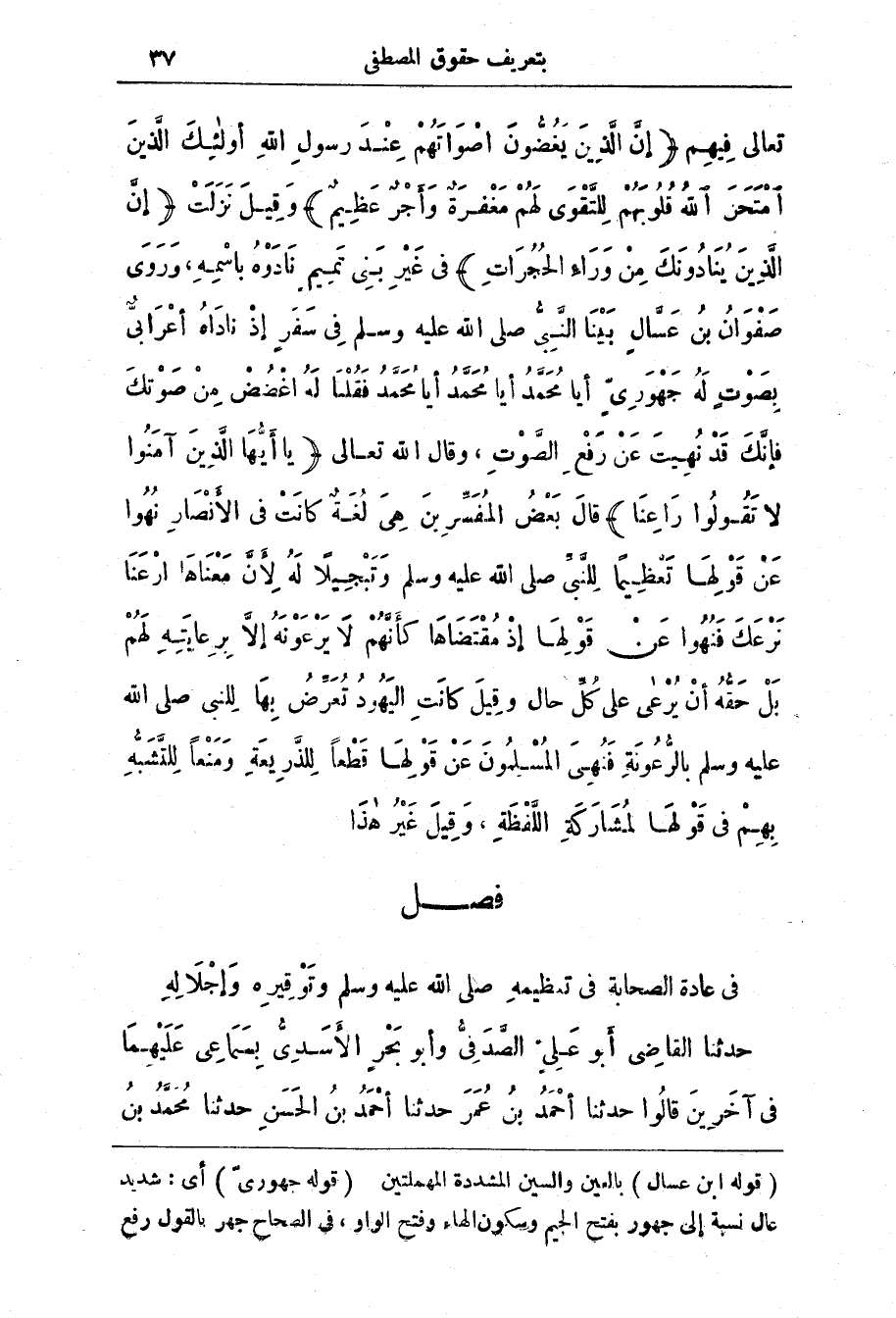 فصل فِي عادة الصَّحَابَةِ فِي تعظيمه صَلَّى اللَّهُ عَلَيْهِ وَسَلَّمَ وتوقيره وإجلاله حَدَّثَنَا الْقَاضِي أَبُو عَلِيٍّ الصَّدَفِيُّ وَأَبُو بَحْرٍ الأَسَدِيُّ بِسَمَاعِي عَلَيْهِمَا فِي آخَرِينَ قَالُوا حَدَّثَنَا أَحْمَدُ بْنُ عُمَرَ حَدَّثَنَا أَحْمَدُ بْنُ الْحَسَنِ حدثنا محمد بن