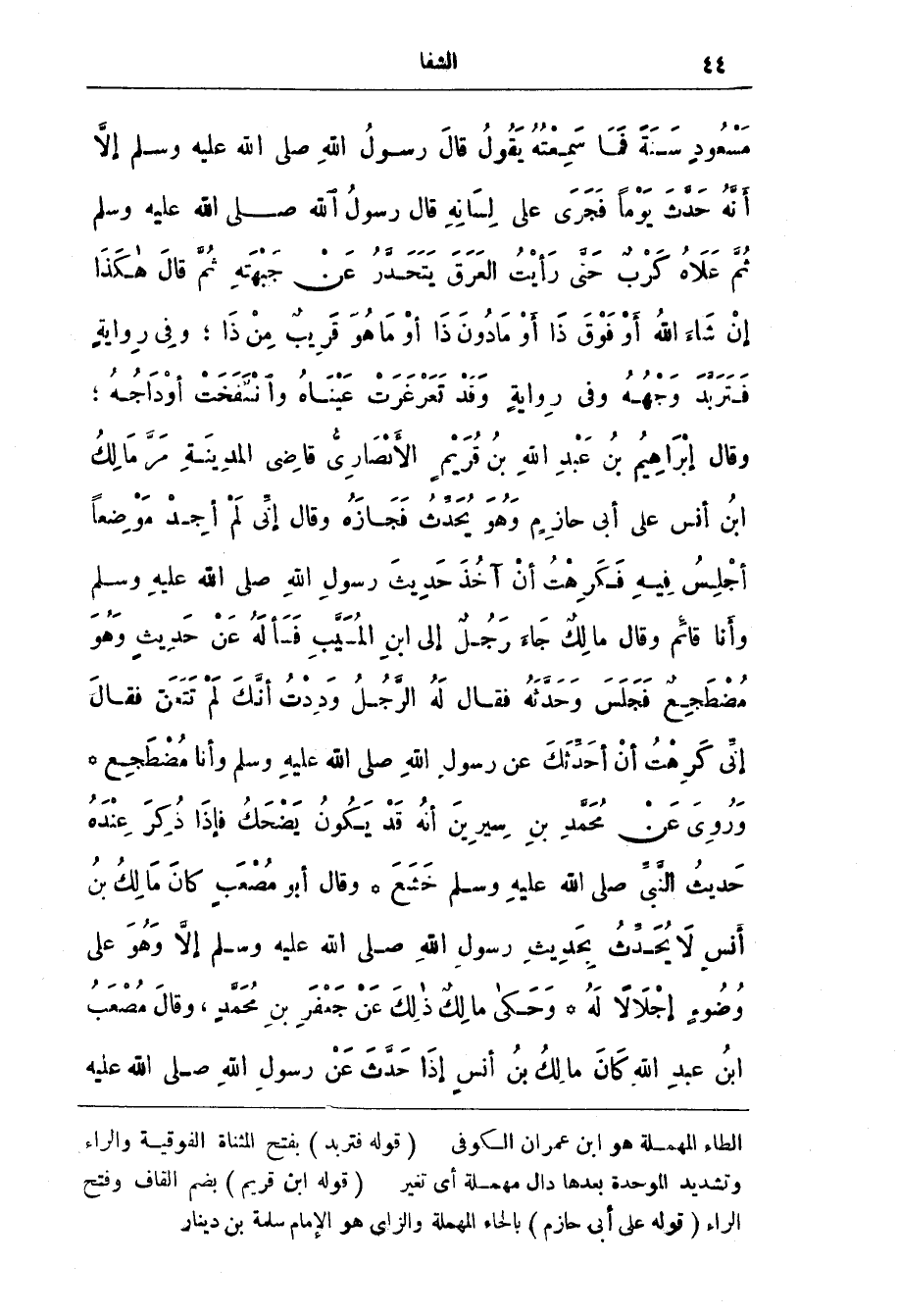 إنّي كَرِهْتُ أنْ أحدثك عن رسول الله صلى الله عليه وَسَلَّمَ وَأَنَا مُضْطَجِع * وَرُويَ عَنْ مُحَمَّدِ بن سِيرِينَ أنَّهُ قَدْ يَكُون يَضْحَكُ فَإِذَا ذُكِرَ عِنْدَهُ حَدِيث النَّبِيّ صَلَّى اللَّهُ عَلَيْهِ وَسَلَّمَ خَشَعَ * وَقَالَ أَبُو مُصْعَب كَانَ مَالِكُ بن أَنَسٍ لَا يُحَدّثُ بِحَدِيث رَسُول اللَّه صَلَّى اللَّهُ عَلَيْهِ وَسَلَّمَ إلَّا وَهُوَ عَلَى وُضُوءٍ إجْلَالًا لَهُ * وَحَكَى مَالِكٌ ذَلِكَ عَنْ جَعْفَرِ بن محمد، وقال مصعب ابن عَبْد اللَّه كَان مَالِك بن أَنَس إذَا حَدَّث عَن رَسُول اللَّه صَلَّى اللَّه عَلَيْه