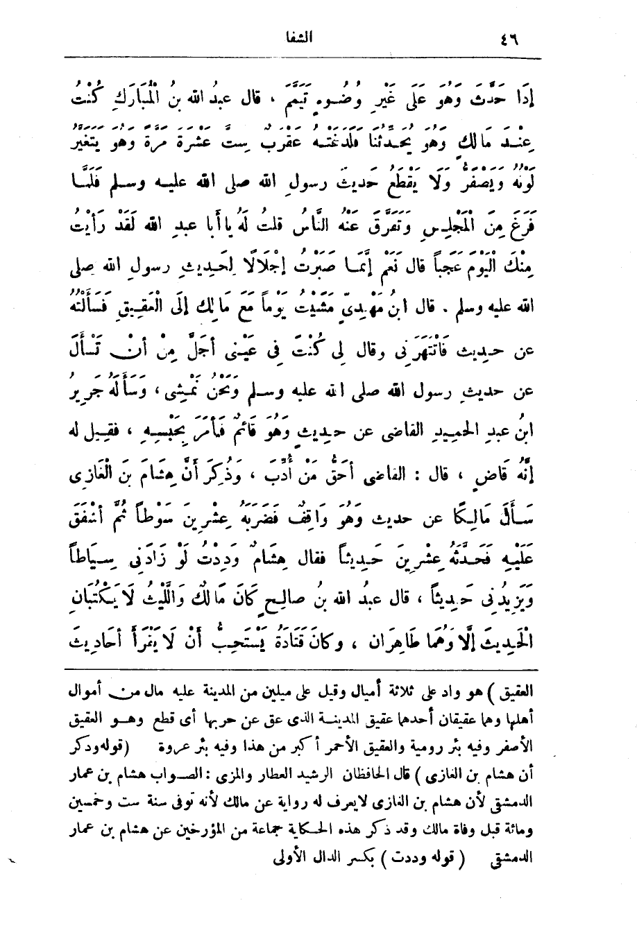 سَأل مَالِكًا عَن حَدِيث وَهُو وَاقِف فَضَرَبَه عِشْرين سَوْطًا ثُمّ أشْفَق عَلَيْه فَحَدَّثَه عِشْرِين حَدِيثًا فَقَال هِشَام وَدِدْت لَو زادني سِيَاطًا وَيَزِيدُنِي حَدِيثًا، قَال عَبْد اللَّه بن صَالِح كَان مَالِك وَاللَّيْث لَا يَكْتُبَان الْحَدِيث إلَّا وَهُمَا طَاهِرَان، وَكَان قَتَادَة يَسْتَحِبّ أن لَا يَقْرَأ أَحَادِيث