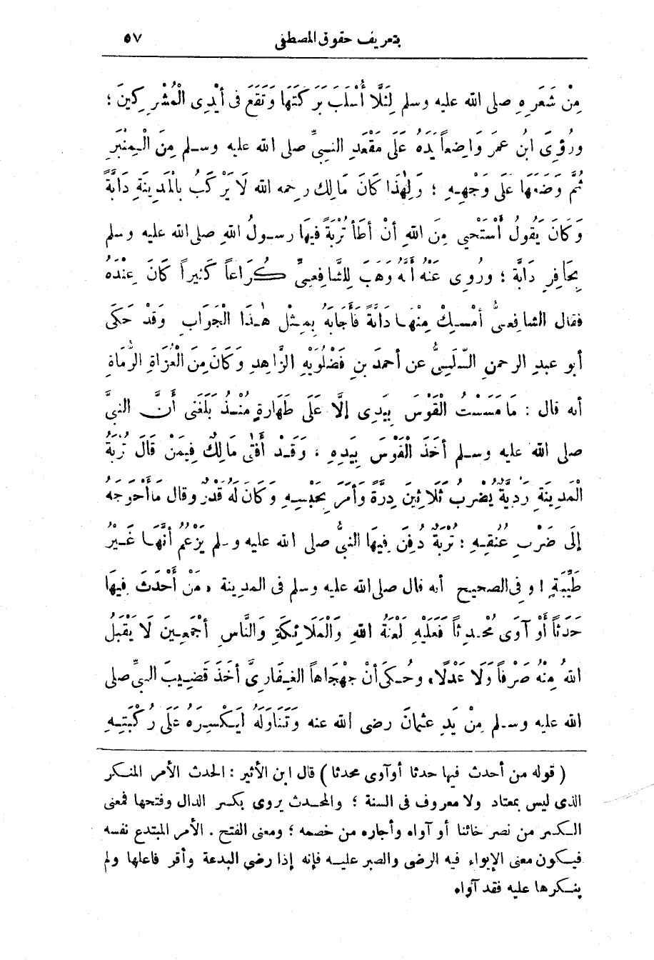 وَكَان يَقُول أسْتَحْيي مِن اللَّه أن أطَأ تُرْبَة فِيهَا رَسُول اللَّه صَلَّى اللَّه عَلَيْه وَسَلَّم بِحَافِر دَابّة، وَرُوي عَنْه أنَّه وَهَب لِلشَّافِعِيّ كُرَاعًا كَثِيرًا كَان عِنْدَه فَقَال الشَّافِعِيّ أمْسِك مِنْهَا دَابَّة فَأَجَابَه بِمِثْل هَذَا الْجَوَاب وَقَد حَكَى أَبُو عَبْد الرَّحْمن السُّلَمِيّ عَن أَحْمَد بن فَضْلُوَيْه الزّاهِد وكان من العزاة الرُّمَاة أنَّه قَال: مَا مَسسْت الْقَوْس بِيَدِي إلَّا عَلَى طَهَارة مُنْذ بَلَغَنِي أَنّ النَّبِيّ صَلَّى اللَّه عَلَيْه وَسَلَّم أَخَذ الْقَوْس بِيَدِه، وَقَد أَفْتى مَالِك فِيمَن قَال تُرْبَة الْمَدِينَة رَدِيَّة يُضْرب ثَلَاثِين دِرَّة وَأَمَر بحسبه وَكَان لَه قَدْر وَقَال مَا أحْوَجَه إِلَى ضرْب عُنُقِه: تُرْبَة دُفِن فِيهَا النَّبِيّ صَلَّى اللَّه عَلَيْه وَسَلَّم يَزْعُم أَنَها غَيْر طَيّبَة! وَفِي الصَّحِيح أنَّه قَال صَلَّى اللَّه عَلَيْه وَسَلَّم فِي الْمَدِينَة (مَنْ أَحْدَثَ فِيهَا حَدَثًا أَوْ آوَى مُحْدِثًا فَعَلَيْهِ لَعْنَةُ اللَّهِ وَالْمَلَائِكَةِ والناس أجمعين لا يَقْبَلُ اللَّهُ مِنْهُ صَرْفًا وَلَا عَدْلًا) وَحُكِي أَن جهْجَاهًا الغِفَاريّ أَخَذ قَضِيب النَّبِيّ صَلَّى اللَّه عَلَيْه وَسَلَّم من يَد عُثْمَان رَضِي اللَّه عَنْه وَتَنَاولَه لَيكْسِرَه عَلَى رُكْبَتِه