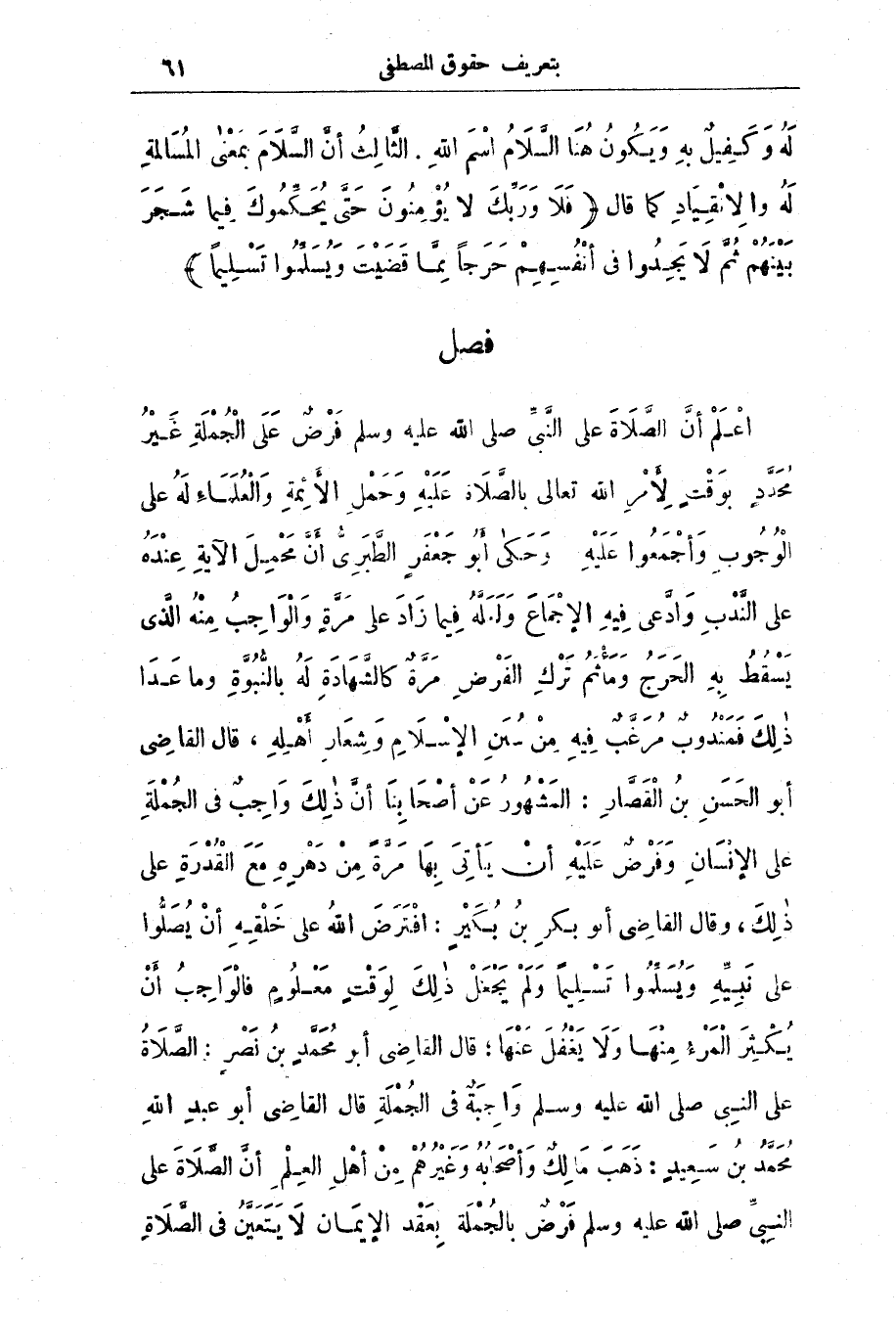 فصل اعْلَم أَنّ الصَّلَاة عَلَى النَّبِيّ صَلَّى اللَّه عَلَيْه وَسَلَّم فَرْض عَلَى الجُمْلَة غَيْر محَدَّد بوَقْت لِأَمْر اللَّه تَعَالَى بِالصَّلَاة عَلَيْه وَحَمْل الْأَئِمَّة وَالْعُلمَاء لَه عَلَى الْوُجُوب وَأجْمَعُوا عَلَيْه وَحَكى أَبُو جَعْفَر الطَّبَرِيّ أَنّ مَحْمِل الآيَة عِنْدَه عَلَى النَّدْب وَادَّعى فِيه الإجْمَاع وَلَعَلَّه فِيمَا زَاد عَلَى مَرَّة وَالْوَاجِب مِنْه الَّذِي يَسْقُط بِه الحَرَج وَمَأْثَم تَرْك الفَرْض مَرَّة كالشَّهَادَة لَه بالنُّبُوَّة وَمَا عَدَا ذَلِك فَمَنْدُوب مُرَغَّب فِيه من سُنَن الْإِسْلَام وَشِعَار أَهْلِه، قَال الْقَاضِي أَبُو الْحَسَن بن الْقَصَّار: المَشْهُور عَن أصْحَابِنَا أَنّ ذَلِك وَاجِب فِي الجُمْلَة عَلَى الْإِنْسَان وَفَرْض عَلَيْه أن يَأتِي بِهَا مَرَّةّ من دَهْرِه مَع الْقُدْرَة عَلَى ذَلِك، وَقَال الْقَاضِي أَبُو بَكْر بن بُكَيْر: افْتَرَض اللَّه عَلَى خَلْقِه أن يُصَلُّوا عَلَى نَبِيّه وَيُسَلّمُوا تَسْلِيمًا وَلَم يَجْعَل ذَلِك لِوَقْت مَعْلُوم فَالْوَاجِب أن يُكْثِر الْمَرْء مِنْهَا وَلَا يَغْفُل عَنْهَا، قَال الْقَاضِي أَبُو مُحَمَّد بن نَصْر: الصَّلَاة عَلَى النَّبِيّ صَلَّى اللَّه عَلَيْه وَسَلَّم وَاجِبَة فِي الجُمْلَة قَال الْقَاضِي أَبُو عَبْد اللَّه مُحَمَّد بن سَعِيد: ذَهَب مَالِك وَأَصْحَابُه وَغَيْرِهِم من أَهْل الْعِلْم أَنّ الصَّلَاة عَلَى النَّبِيّ صَلَّى اللَّه عَلَيْه وَسَلَّم فَرْض بِالجُمْلَة بِعَقْد الْإِيمَان لَا يَتَعَيَّن فِي الصَّلَاة
