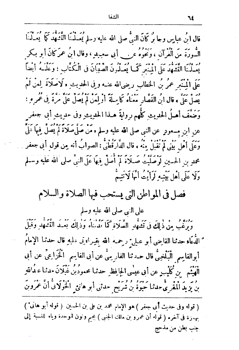 فصل فِي المواطن التي يستحب فِيهَا الصَّلَاة والسَّلَام عَلَى النَّبِيّ صَلَّى اللَّه عَلَيْه وَسَلَّم وَيُرَغَّب من ذَلِك فِي تَشَهُّد الصَّلَاة كَمَا قَدَّمْناه وَذَلِك بَعْد التَّشَهُّد وَقَبْل الدُّعَاء حَدَّثَنَا الْقَاضِي أَبُو عَلِيٍّ رحمه الله بقراءتي عَلَيْهِ قَالَ حَدَّثَنَا الْإِمَامُ أَبُو الْقَاسِمِ الْبَلْخِيُّ قَالَ حَدَّثَنَا الْفَارِسِيُّ عَنْ أَبِي الْقَاسِمِ الْخُزَاعِيِّ عَنْ أَبِي