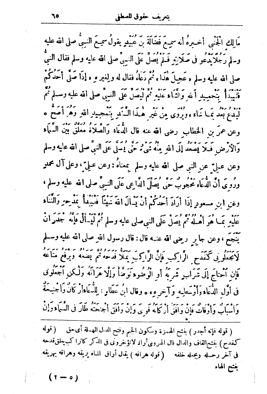 مَالِكٍ الْجَنْبِيَّ أَخْبَرَهُ أنَّه سَمِعَ فَضَالَةَ بْنَ عُبَيْدٍ يَقُول سَمِعَ النَّبِيُّ صَلَّى اللَّهُ عَلَيْه وَسَلَّم رَجُلًا يَدْعُو فِي صَلَاتِه فَلَم يُصَلّ على النبي صلى الله عليه وسلم فقال النَّبِيّ صَلَّى اللَّه عَلَيْه وَسَلَّم (عَجِلَ هَذَا) ثُمَّ دَعَاهُ فَقَالَ لَهُ وَلِغَيْرِهِ (إِذَا صَلَّى أحدكم فتيبدأ بِتَحْمِيدِ اللَّهِ وَالثَّنَاءِ عَلَيْهِ ثُمَّ لِيُصَلِّ عَلَى النَّبِيِّ صَلَّى اللَّهُ عَلَيْهِ وَسَلَّمَ ثُمَّ لِيَدْعُ بَعْدُ بِمَا شَاءَ) وَيُرْوَى مِنْ غَيْرِ هَذَا السد بِتَمْجِيدِ اللَّهِ وَهُوَ أَصَحُّ * وَعَن عُمَر بن الْخَطَّاب رَضِي اللَّه عَنْه قال الدُّعَاءُ وَالصَّلَاةُ مُعَلَّقٌ بَيْنَ السَّمَاءِ وَالْأَرْضِ فَلَا يَصْعَدُ إِلَى الله منه شئ حَتَّى يُصَلَّى عَلَى النَّبِيِّ صَلَّى اللَّهُ عَلَيْهِ وَسَلَّمَ وَعَن عَلِيّ عَن النَّبِيّ صَلَّى اللَّه عَلَيْه وَسَلَّم بِمعناه: وَعَن عَلِيّ، وَعَلَى آل مُحَمَّد وَرُوي أَنّ الدُّعَاء مَحْجُوب حَتَّى يُصَلّي الدّاعِي عَلَى النَّبِيّ صَلَّى اللَّه عَلَيْه وَسَلَّم، وَعَن ابن مَسْعُود إذَا أرَاد أَحَدُكُم أن يَسْأَل اللَّه شَيْئًا فتيبدأ بِمَدْحِه وَالثَّنَاء عَلَيْه بِمَا هُو أهْلُه ثُمّ يُصَلّ عَلَى النبي صلى الله عليه وسلم ثُمّ ليَسْأل فَإنَّه أَجْدَر أَن يَنْجَح، وَعَن جَابِر رَضِي اللَّه عَنْه قَال: قَال رَسُول اللَّه صَلَّى اللَّه عَلَيْه وَسَلَّم لَا تَجْعَلُونِي كَقَدَحِ الرَّاكِبِ فَإِنَّ الرَّاكِبَ يَمْلأُ قَدَحَهُ ثُمَّ يَضَعُهُ وَيَرْفَعُ مَتَاعَهُ فَإِنِ احْتَاجَ إِلَى شَرَابٍ شَرِبَهُ أَوِ الوضوء وضأ وَإِلَّا هَرَاقَهُ وَلَكِنِ اجْعَلُونِي فِي أَوَّلِ الدُّعَاءِ وَأَوْسَطَهُ وَآخِرَهُ) * وَقَال ابن عَطَاء: لِلدُّعَاء أرْكَان وَأجنِحَة وَأسْبَاب وَأوْقَات فَإِن وَافَق أرْكَانَه قَوِي وَإن وَافَق اجْنَحَته طَار فِي السَّمَاء وَإن