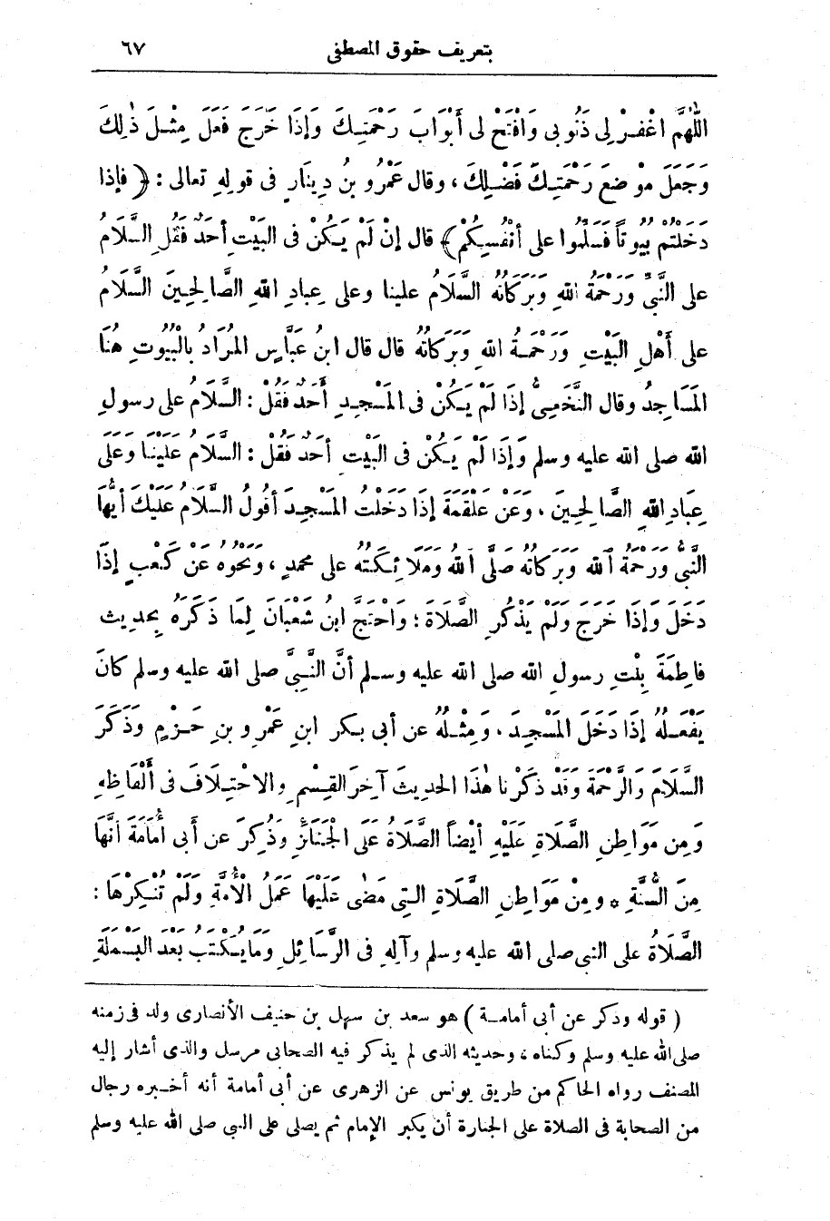 وَمِثْلُه عَن أَبِي بَكْر ابن عَمْرو بن حَزْم وَذَكَر السَّلَام وَالرَّحْمَة وَقَد ذَكَرْنَا هَذَا الْحَدِيث آخِر القِسْم والاخْتِلَاف فِي أَلْفَاظِه وَمِن مَوَاطِن الصَّلَاة عَلَيْه أيْضًا الصَّلَاة عَلَى الْجَنَائِز وَذُكِر عَن أَبِي أُمَامَة أنَّهَا مِن السُّنَّة * وَمِن مَوَاطِن الصَّلَاة التي مَضى عَلَيْهَا عَمَل الْأُمَّة وَلَم تُنْكِرْهَا: الصَّلَاة عَلَى النَّبِيّ صَلَّى اللَّه عَلَيْه وَسَلَّم وآلِه فِي الرَّسَائِل وَمَا يسكتب بعد البسملة