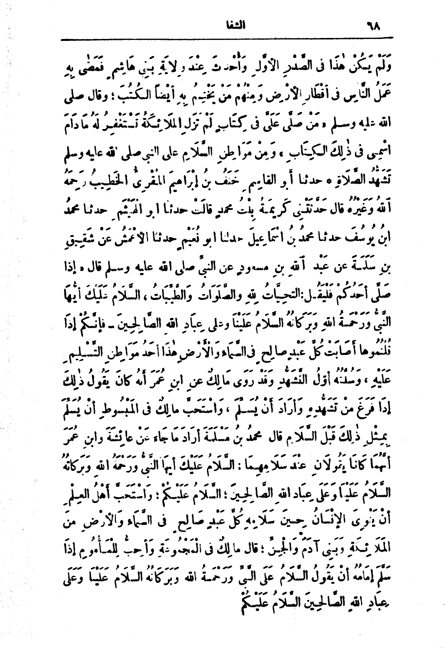 وَلَم يَكُن هَذَا فِي الصَّدْر الأَوَّل وَأُحْدِث عِنْد وِلايَة بنى هاشم فمصى بِه عَمَل النَّاس فِي اقْطَار الْأَرْض وَمِنْهُم من يَخْتِم بِه أيْضًا الْكُتُب، وَقَال صَلَّى اللَّه عَلَيْه وَسَلَّم (مَنْ صَلَّى عَلَيَّ فِي كِتَابٍ لَمْ تَزَلِ الملائكة تستغفر له مَا دَامَ اسْمِي فِي ذَلِكَ الْكِتَابِ) وَمِن مَوَاطِن السَّلَام عَلَى النَّبِيّ صَلَّى اللَّه عَلَيْه وَسَلَّم تَشَهُّد الصَّلَاة * حَدَّثَنَا أَبُو الْقَاسِمِ خَلَفُ بْنُ إِبْرَاهِيمَ الْمُقْرِي الْخَطِيبُ رَحِمَهُ اللَّهُ وَغَيْرُهُ قَالَ حَدَّثَتْنِي كَرِيمَةُ بِنْتُ مُحَمَّدٍ قَالَتْ حَدَّثَنَا أَبُو الْهَيْثَمِ حَدَّثَنَا مُحَمَّدُ ابن يُوسُفَ حَدَّثَنَا مُحَمَّدُ بْنُ إِسْمَاعِيلُ حَدَّثَنَا أَبُو نُعَيْمٍ حَدَّثَنَا الأَعْمَشُ عَنْ شَقِيقِ بْنِ سَلَمَةَ عَنْ عَبْدِ اللَّهِ بْنِ مَسْعُودٍ عَنِ النَّبِيِّ صَلَّى اللَّهُ عَلَيْهِ وَسَلَّمَ قَالَ (إِذَا صَلَّى أَحَدُكُمْ فَلْيَقُلِْ: التَّحِيَّاتُ لِلَّهِ وَالصَّلَوَاتُ وَالطَّيِّبَاتُ، السَّلامُ عَلَيْكَ أيها النبي ورحمة الله وبركاته السلام عَلَيْنَا وَعَلَى عِبَادِ اللَّهِ الصَّالِحِينَ - فَإِنَّكُمْ إِذَا قُلْتُمُوهَا أَصَابَتْ كُلَّ عَبْدٍ صَالِحٍ فِي السَّمَاءِ وَالأَرْضِ هَذَا أَحَدُ مَوَاطِنِ التَّسْلِيمِ عَلَيْهِ، وَسُنَّتُهُ أَوَّلُ التَّشَهُّدِ وَقَدْ رَوَى مَالِكٌ عَنِ ابْنِ عُمَرَ أَنَّهُ كَانَ يَقُولُ ذَلِكَ إِذَا فَرَغَ مِنْ تَشَهُّدٍ وَأَرَادَ أَنْ يُسَلِّمَ، وَاسْتَحَبَّ مَالِك فِي المَبْسُوط أن يُسَلّم بِمِثْل ذَلِك قَبْل السَّلَام قَال مُحَمَّد بن مَسْلَمَة أرَاد مَا جَاء عَن عَائِشَة وَابْن عمر أنها كَانَا يَقُولان عِنْد سَلامهِمَا.