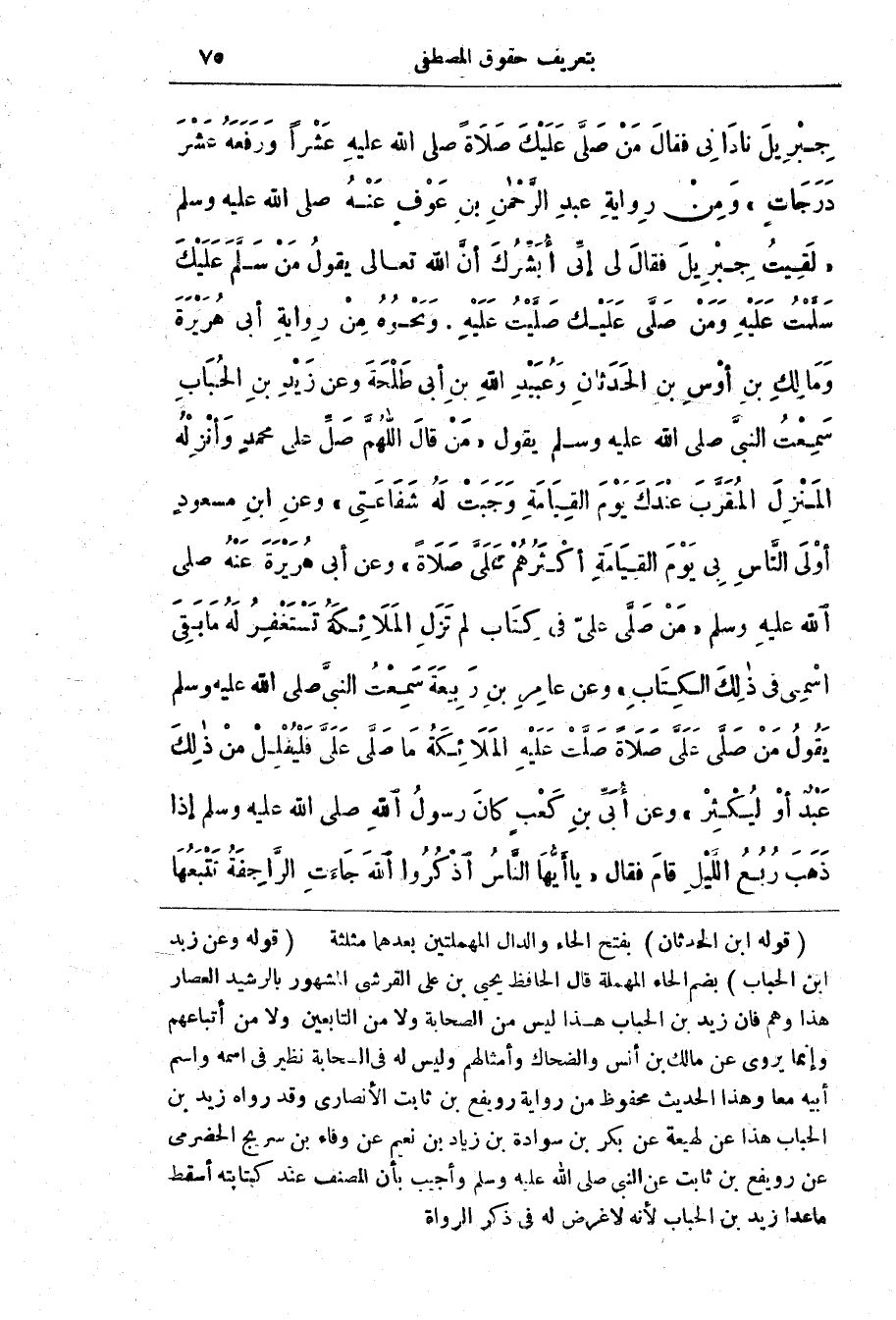 وَنَحْوَهُ من رِوَايَة أَبِي هُرَيْرَة ومالك بن أوْس بن الحَدَثان وَعُبَيْد اللَّه بن أَبِي طلحة وَعَن زَيْد بن الْحُبَاب سَمِعْت النَّبِيّ صَلَّى اللَّه عَلَيْه وَسَلَّم يَقُول (مَنْ قَالَ اللَّهُمَّ صَلِّ عَلَى مُحَمَّدٍ وَأَنْزِلْهُ الْمَنْزِلَ الْمُقَرَّبَ عِنْدَكَ يَوْمَ الْقِيَامَةِ وَجَبَتْ لَهُ شَفَاعَتِي) وَعَنِ ابْنِ مَسْعُودٍ أَوْلَى النَّاسِ بِي يَوْمَ الْقِيَامَةِ أَكْثَرُهُمْ عَلَيَّ صَلَاةً) وَعَن أبي هريرة عنه صلى الله عليه وسلم (مَنْ صَلَّى عَلَيَّ فِي كِتَابٍ لَمْ تَزَلِ الْمَلَائِكَةُ تَسْتَغَفِرْ لَهُ مَا بَقِي اسْمِي فِي ذَلِكَ الْكِتَابِ) وَعَن عامِر بن رَبِيعَة سَمِعْت النبي صلى الله عليه وسلم يقول مَنْ صَلَّى صَلَاة صَلَّت عَلَيْه الْمَلَائِكَة مَا صَلَّى عَلَيّ فليقل من ذَلِك عَبْد أَو لِيُكْثِر) وَعَن أبَيّ بن كَعْب كَان رَسُول اللَّه صَلَّى اللَّه عَلَيْه وَسَلَّم إذَا ذَهَب رُبُع اللَّيْل قَام فَقَال (يَا أيُّهَا النَّاس اذْكُرُوا اللَّه جَاءَت الرَّاجِفَة تَتْبَعُهَا