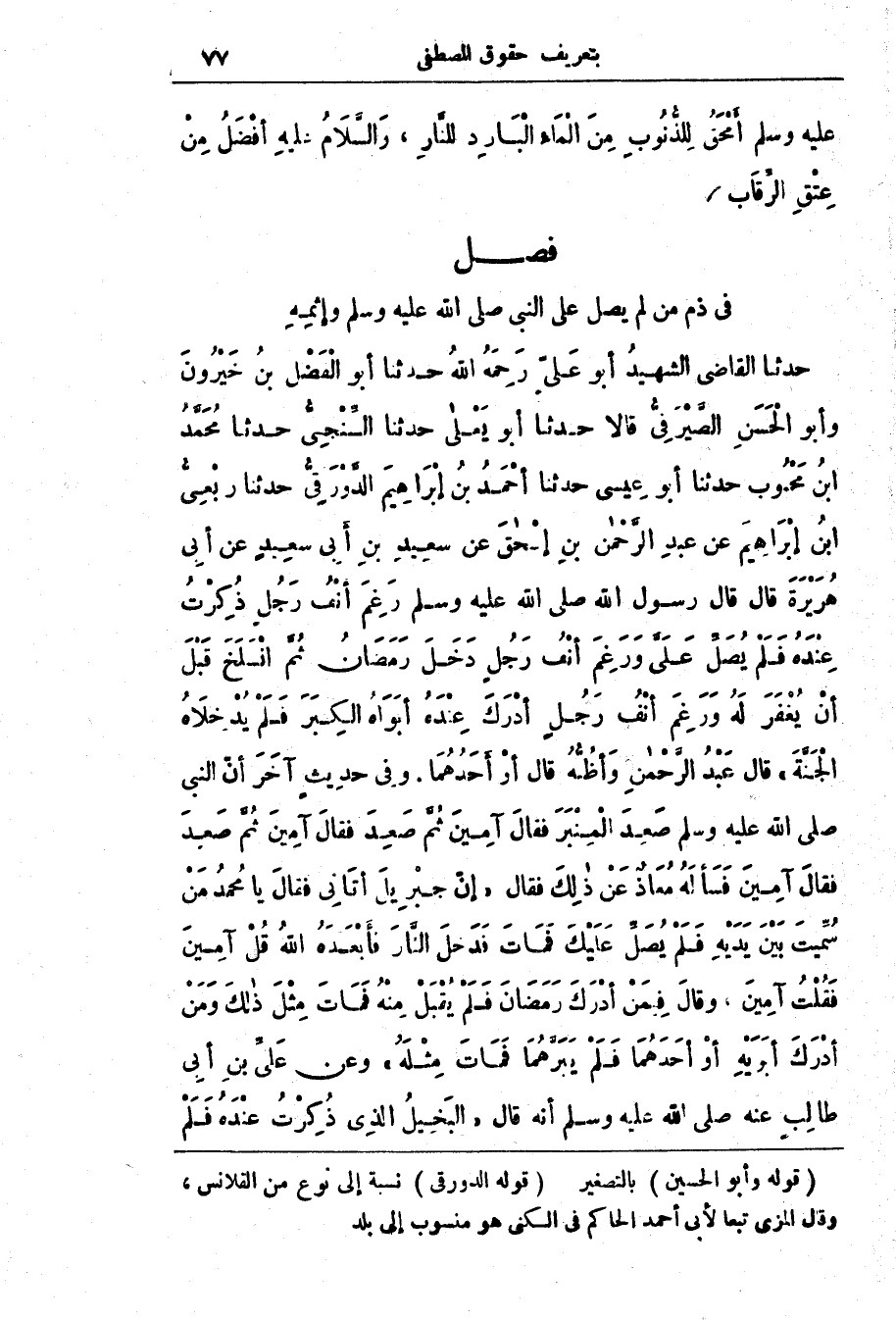 حَدَّثَنَا الْقَاضِي الشَّهِيدُ أَبُو عَلِيٍّ رَحِمَهُ اللَّهُ حَدَّثَنَا أبو الفضل بن خيرون وأبو الحسن الصَّيْرَفِيُّ قَالا حَدَّثَنَا أَبُو يَعْلَى حَدَّثَنَا السِّنْجِيُّ حَدَّثَنَا مُحَمَّدُ ابْنُ مَحْبُوبٍ حَدَّثَنَا أَبُو عِيسَى حَدَّثَنَا أَحْمَدُ بْنُ إبراهيم الدَّوْرَقِيُّ حَدَّثَنَا رَبْعِيُّ ابن إبْرَاهِيمَ عَنْ عَبْدِ الرَّحْمَنِ بْنِ إِسْحَاقَ عَنْ سَعِيدِ بْنِ أَبِي سَعِيدٍ عَنْ أَبِي هُرَيْرَةَ قال قال رسول الله صلى الله عليه وسلم رغم أنف رَجُلٍ ذُكِرْتُ عِنْدَهُ فلم يصل على وَرَغِمَ أَنْفُ رَجُلٍ دخل رمصان ثُمَّ انْسَلَخَ قَبْلَ أَنْ يُغْفَرَ لَهُ وَرَغِمَ أَنْفُ رَجُلٍ أَدْرَكَ عِنْدَهُ أَبَوَاهُ الْكِبَرُ فَلَمْ يُدْخِلاهُ الْجَنَّةَ) قَالَ عَبْدُ الرَّحْمَنِ وَأَظُنُّهُ قَالَ أَوْ أَحَدُهُمَا.